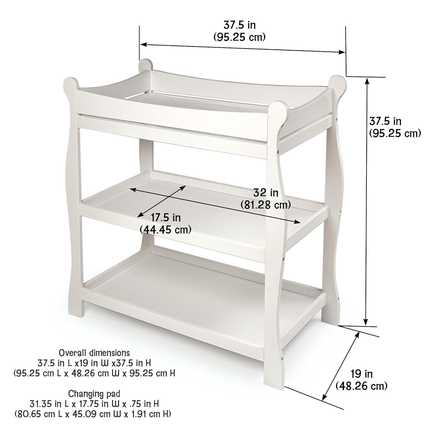 Badger Basket Sleigh Style Baby Changing Table - Nursery Diaper Station with Safety Rails, Foam Pad, and Two Storage Shelves - Nursery Organizer - White