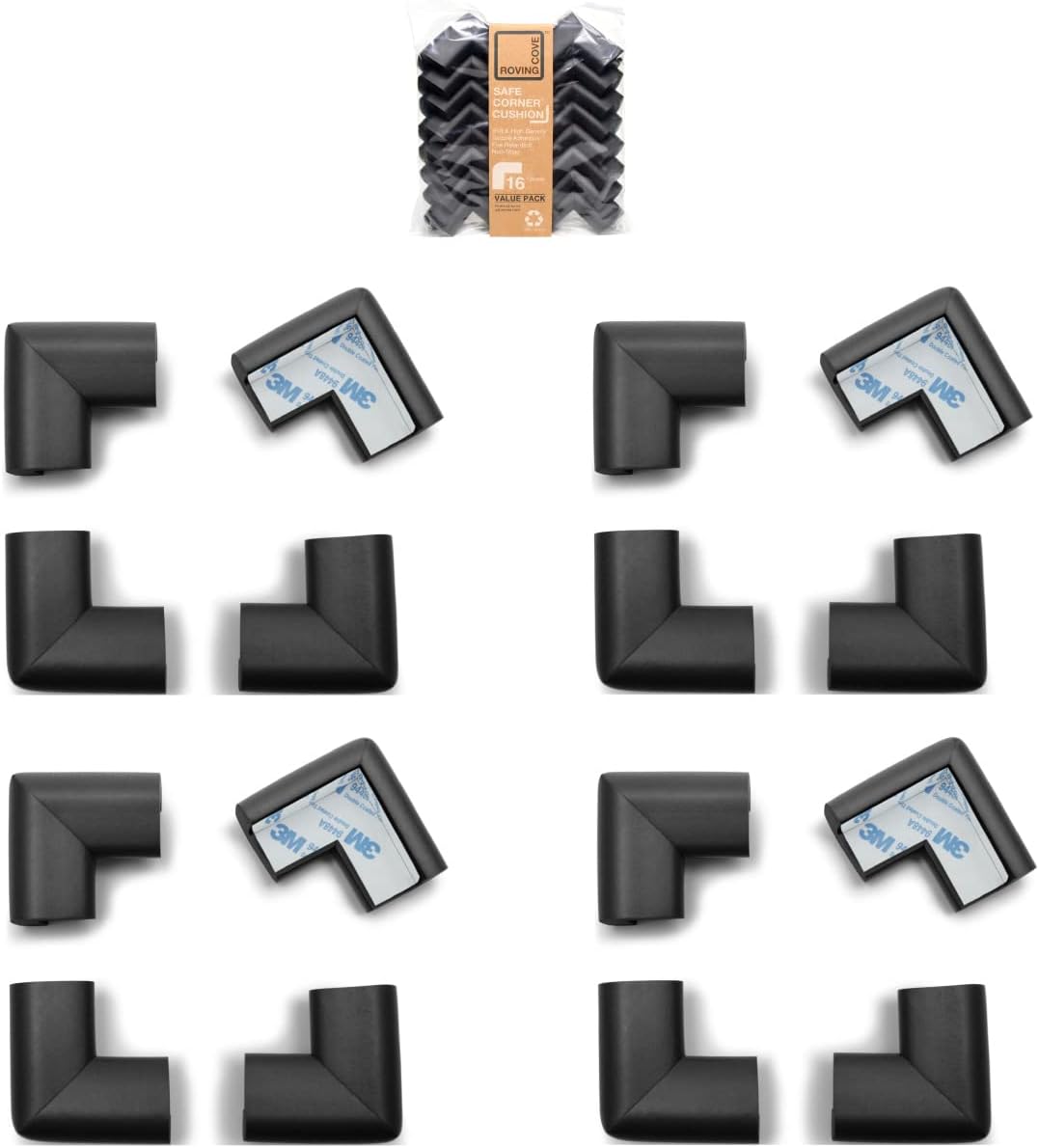 Roving Cove HeftyFit Corner Protector for Baby (16 Large Corners), Heavy-Duty Soft Rubber Foam Furniture Corner Bumper Guards, 3M Adhesive Pre-Taped, Onyx Black