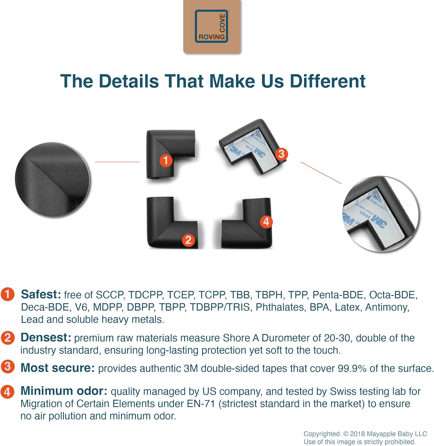 - DESIGNED IN USA: Includes 16 large premium, pre-taped, baby proofing corner guards. All text and photos/images in this product listing are copyrighted materials. Copyright: 2012 Mayapple Baby LLC, Brooklyn NY, USA.