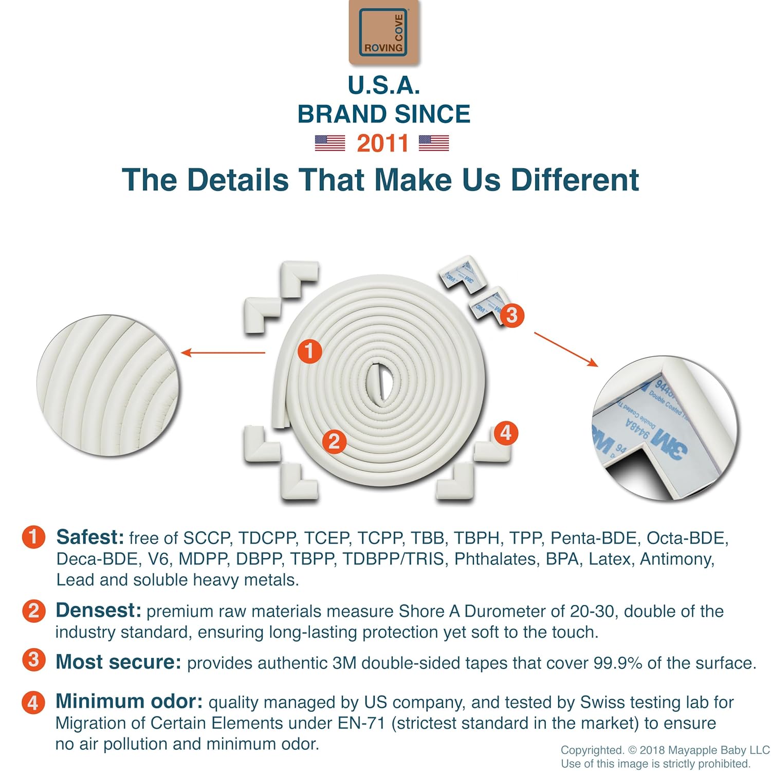 - CLEAN SAFETY: Roving Cove uses safe and pure raw material and was the first brand to make foam safety bumpers without the use of toxic flame-retardant chemicals (SCCPs). Our edge corner guards contain no BPA, no phthalates, no heavy metals, no latex, no SCCPs. Inherently flame-resistant; passed flammability tests under US regulations.
