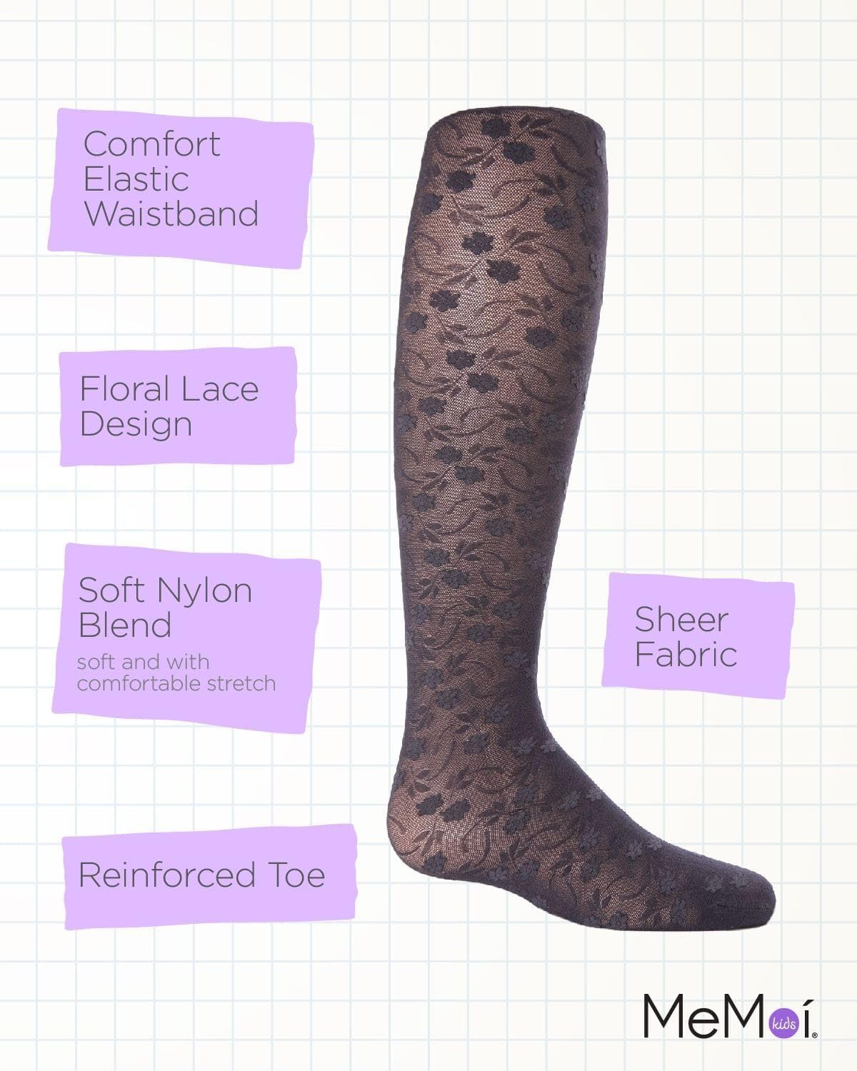 MeMoi Sweet Blossoms Sheer Tights for Girls, Ultra Soft and Lightweight Floral Lace Girls Tights - Sizes 2-14