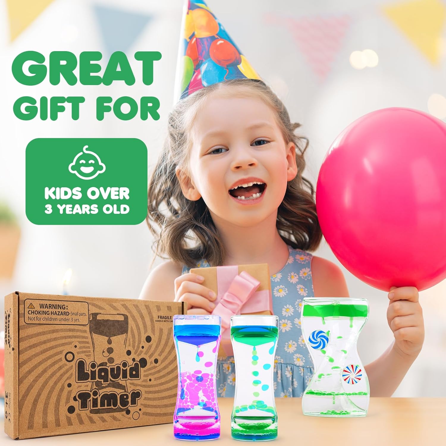 - THERAPEUTIC TOOL: The slow and rhythmic drops of this liquid hourglass timer have a very soothing effect and actually help kids and adults with sensory issues, making this a perfect sensory toy for kids with special needs, autism, and ADHD. A liquid bubble timer toy can also help fight anxiety, stress, and boredom.