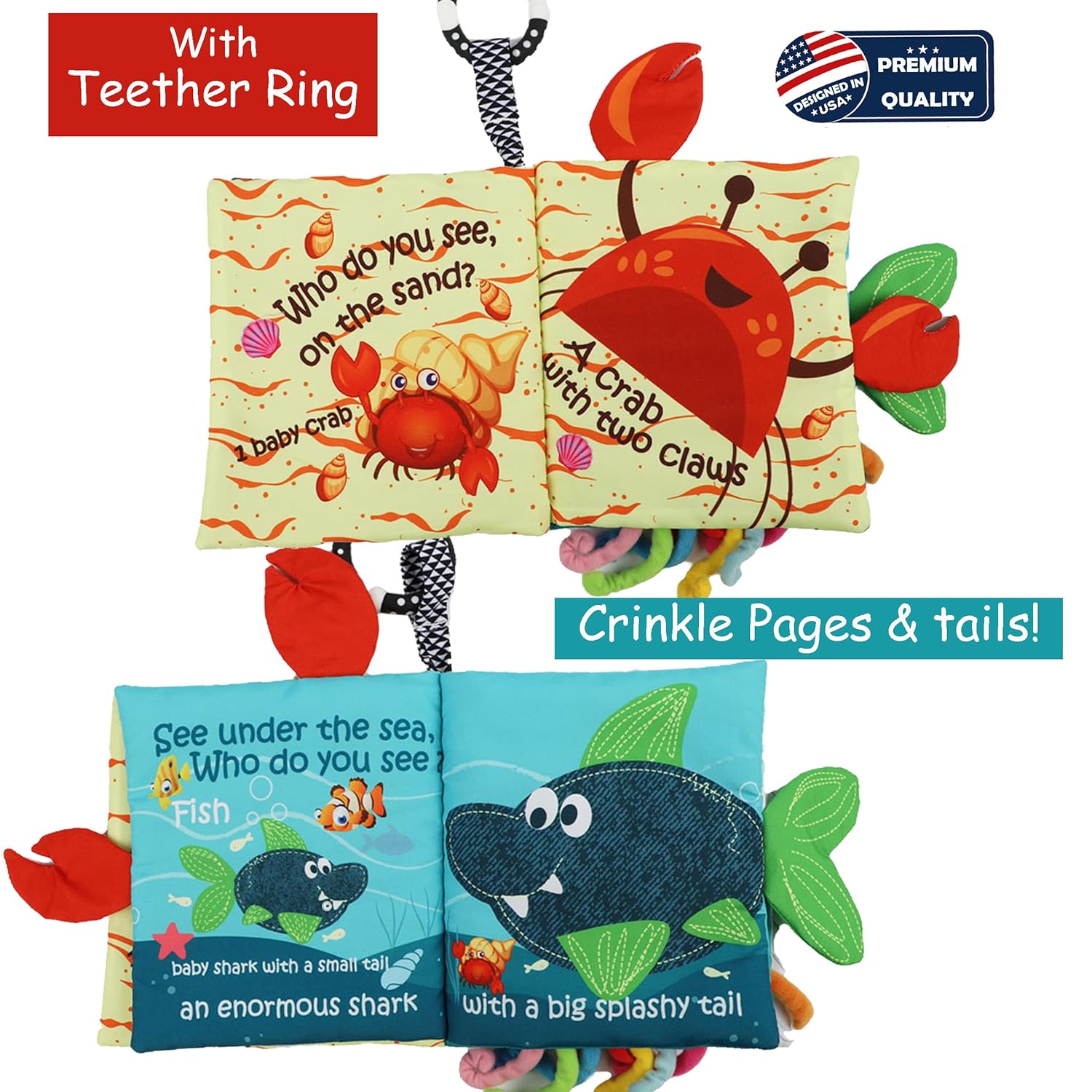 - Baby Books 0-6 Months, Interactive Activity Fish Book: Be a child once again! Lift-the-flap,play peek-a-boo, Search for hidden surprises in the crinkle books,Touch and feel textures,gaining self-awareness & discovery through baby mirror toy & enjoy crinkle pages! This baby toys 3-6 months, soft fabric book encourages adventure & discovery of the colorful undersea world.Your baby will be attracted by 3D baby octopus toy,sea animal,baby crab & fishy tails.You can watch her/his little eye’s dance!