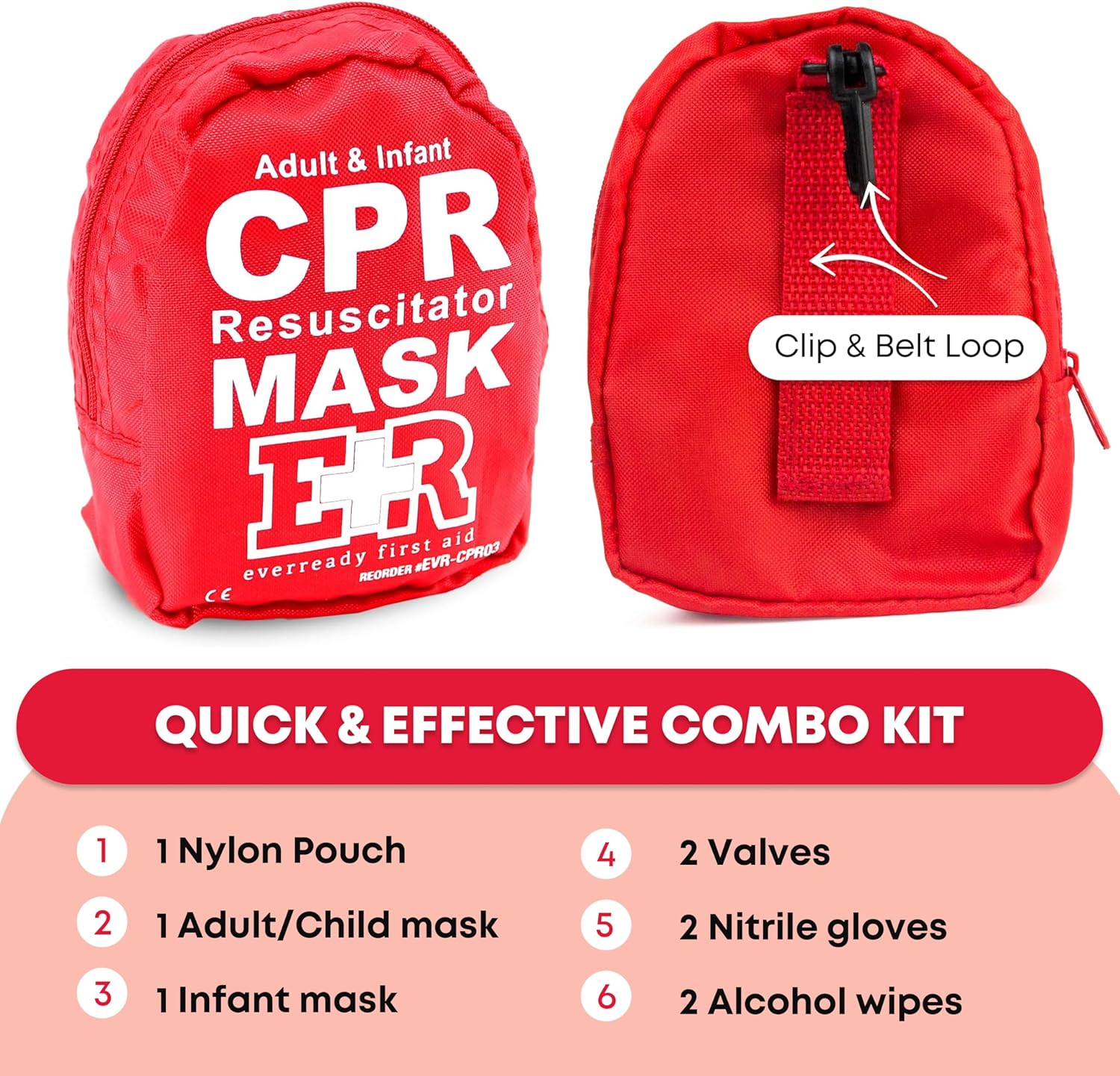 - QUICK & EFFECTIVE COMBO KIT- This all-in-one kit includes everything you need to safely perform CPR in any situation. The kit includes an Adult and Infant CPR mask, 2 Valves, A pair of vinyl gloves, and 2 alcohol prep pads.