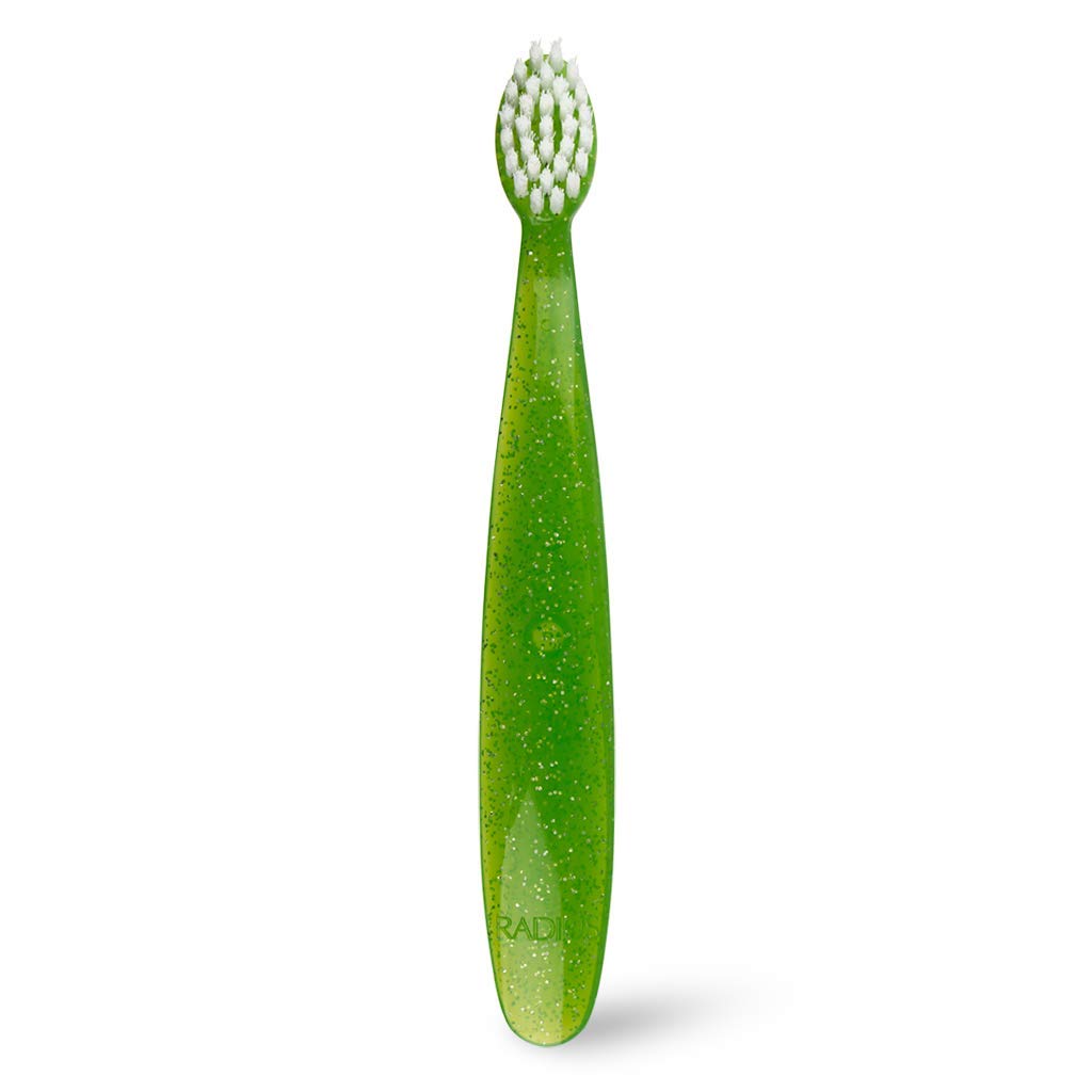 RADIUS Toddler Toothbrush and Toothpaste Bundle for Kids, 2 Pack Totz Extra Soft Brush in Blue and Green Sparkle and 1 Count Dragon Fruit Toothpaste, for Children 18 Months and Up