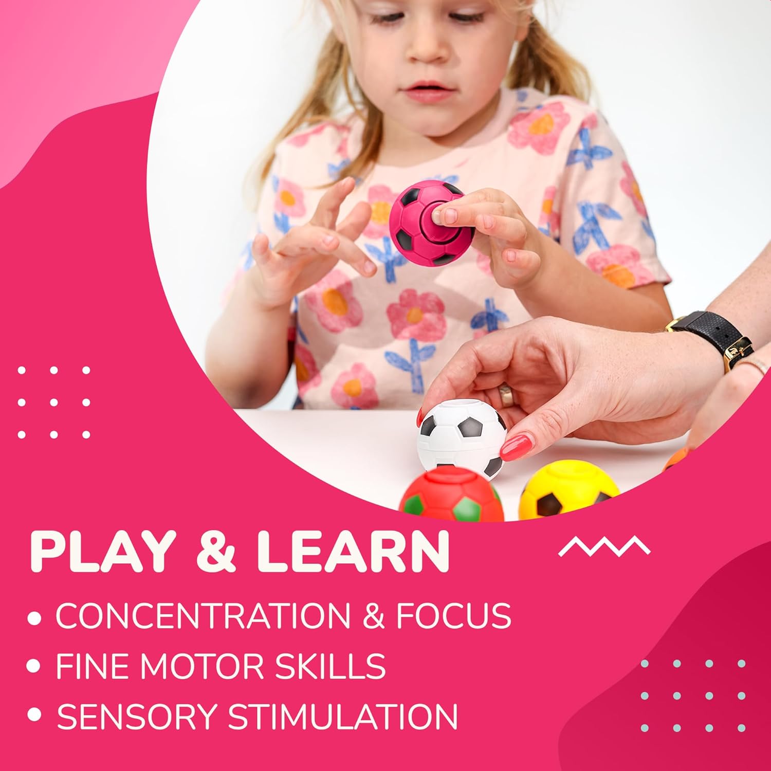 - Spinner toy have a pink color. Spinner toys for kids resemble a soccer ball