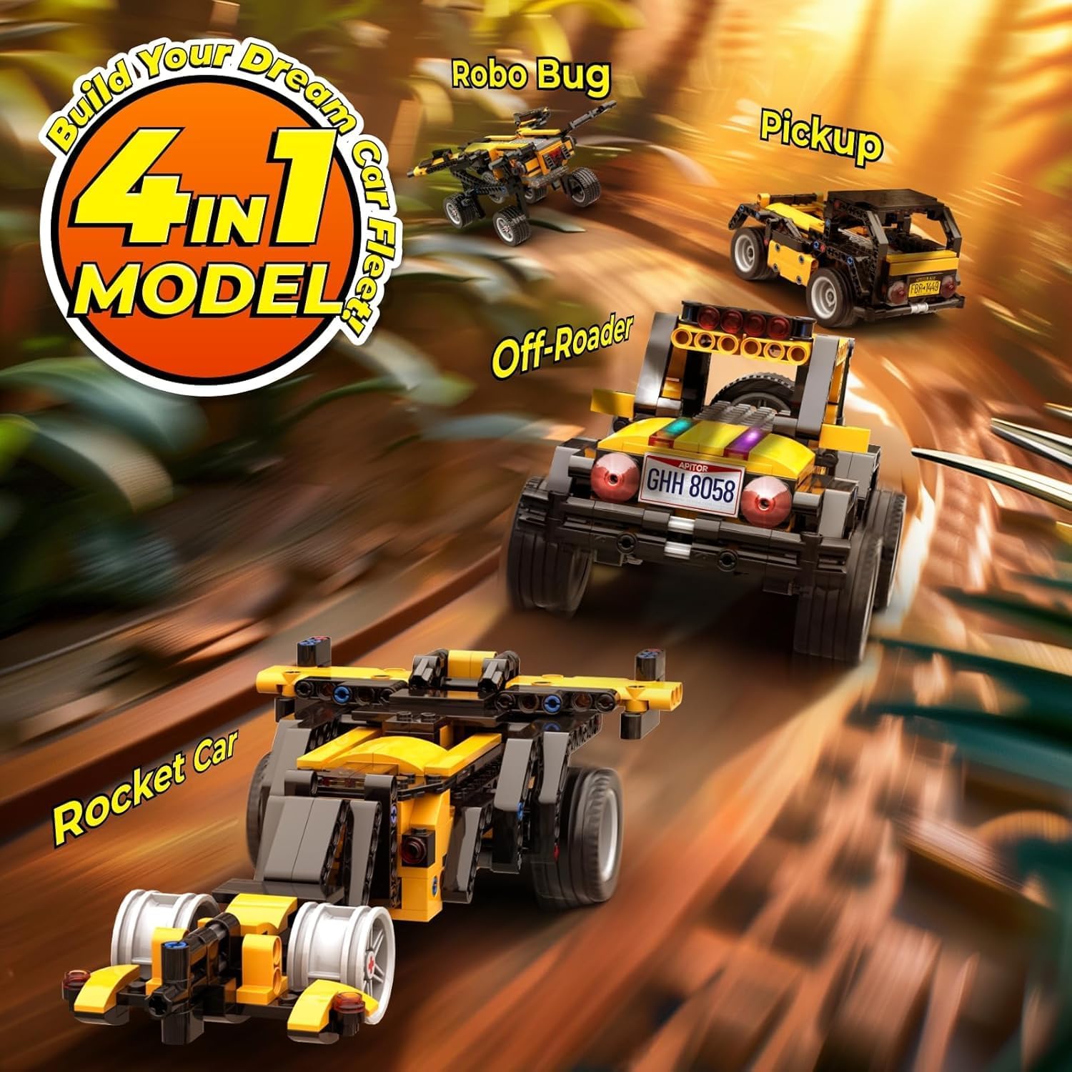 - Authentic Design for Car Enthusiasts: Featuring an eye-catching yellow-and-black color scheme, full-size spare tire, classic round headlights, and custom license plates, this robot kit looks as cool as it functions! A must have for young car and off-roader enthusiasts who love realistic designs.