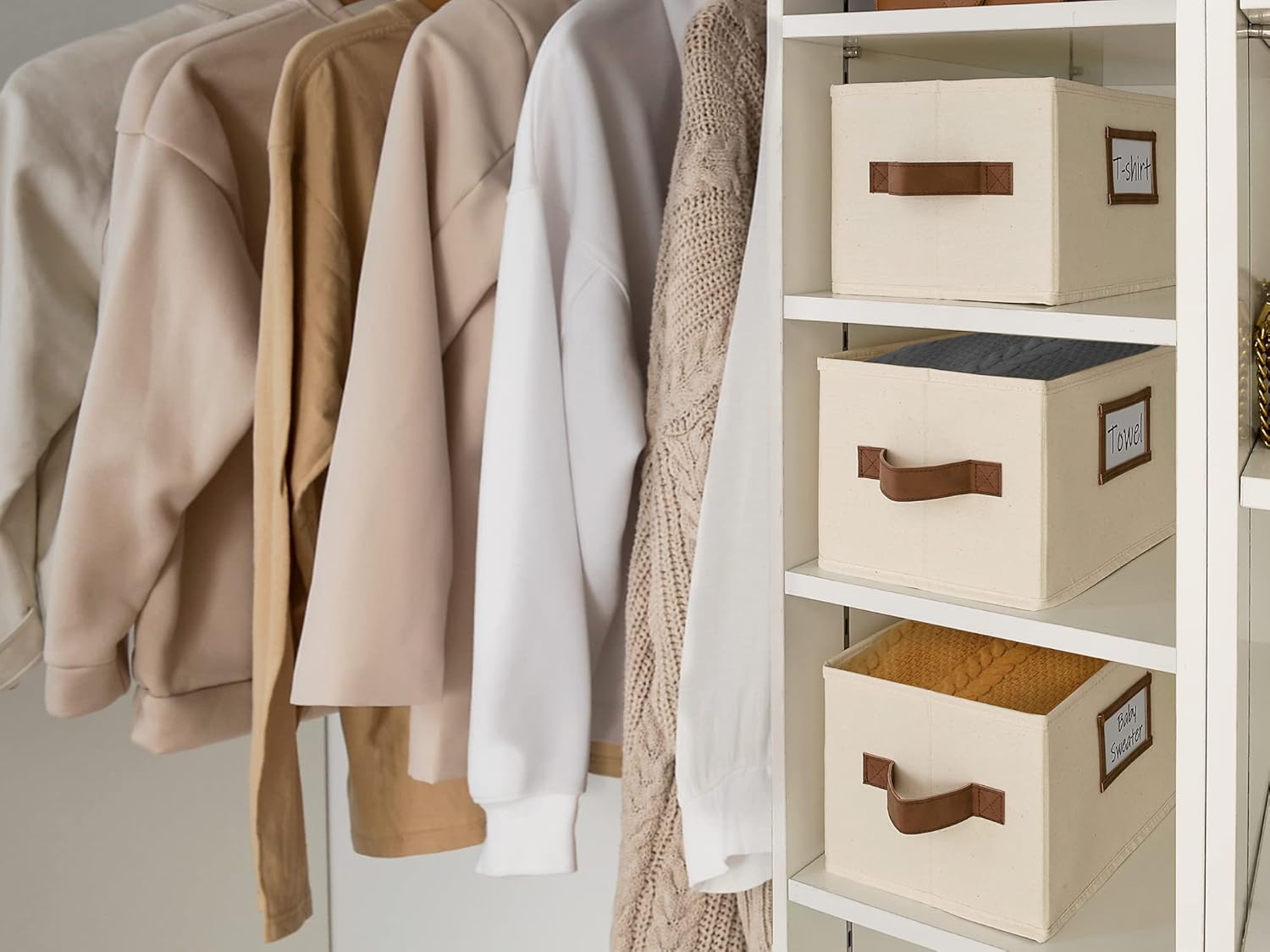 StorageWorks Storage Baskets for Shelves, Foldable Fabric Closet Storage Bins with PU Handles, Fabric Storage Bins Clothes Organizer, Ivory White, 3-Pack, Small