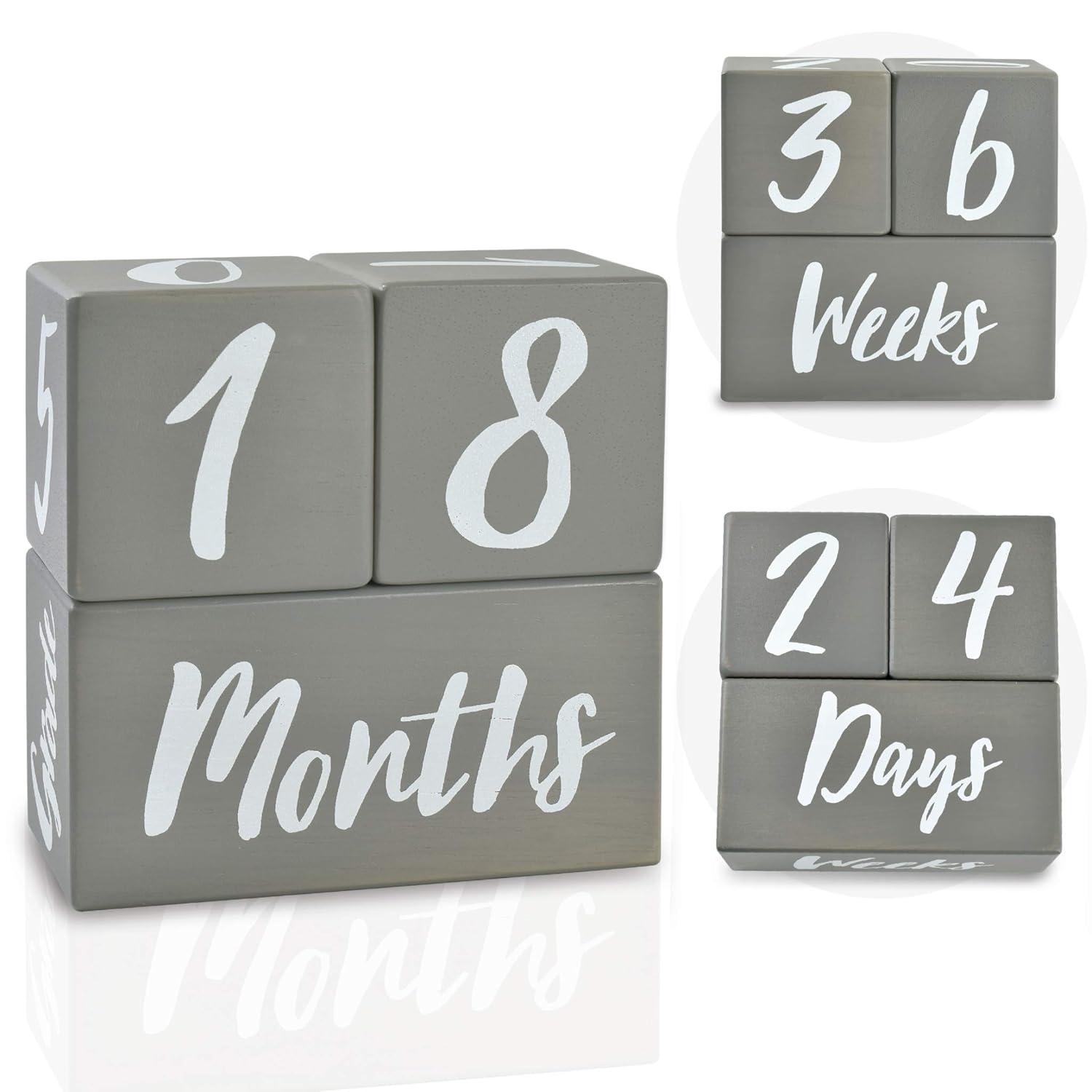 - ECO SOLID WOOD: A set of 3 solid wood baby milestone blocks printed with large numbers 0-9, growth measurement classifiers; Days, Weeks, Months, Years, Lbs, Grade, and emoji lovely graphics. Possible to make number combinations of age range from birth to adult. Awesome for weekly pregnancy countdown or tracking baby's important milestone. Large block is 4.8" x 2.5" and small blocks are 2.4" cubes.