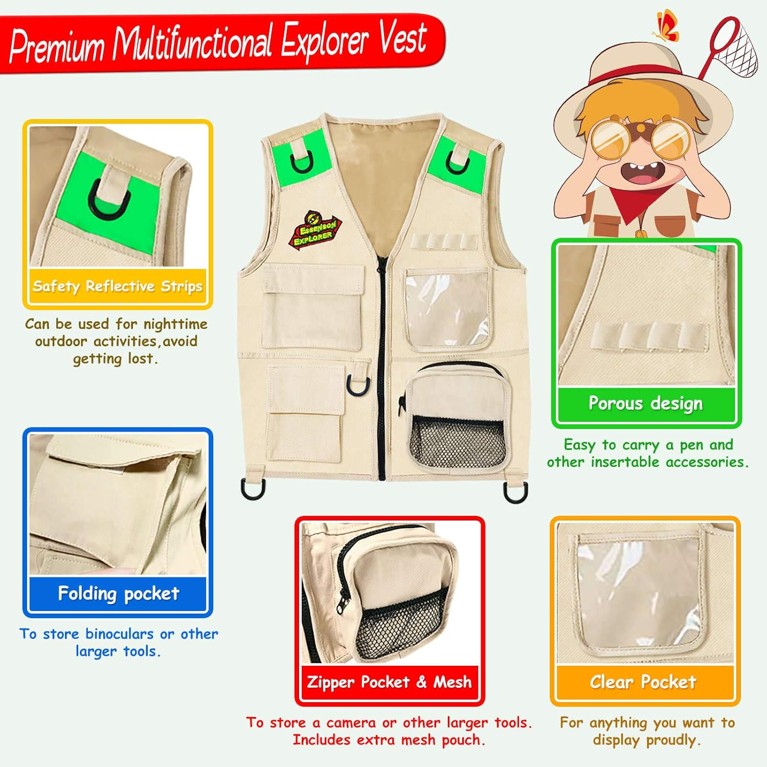 - Nature Explorer & Adventure Kit: Full kids explorer and adventure set includes: Vest, explorer hat, butterfly net, optical 5x binoculars, water bottle buckle, bug jar, magnifying glass, whistle, bug tongs, backpack