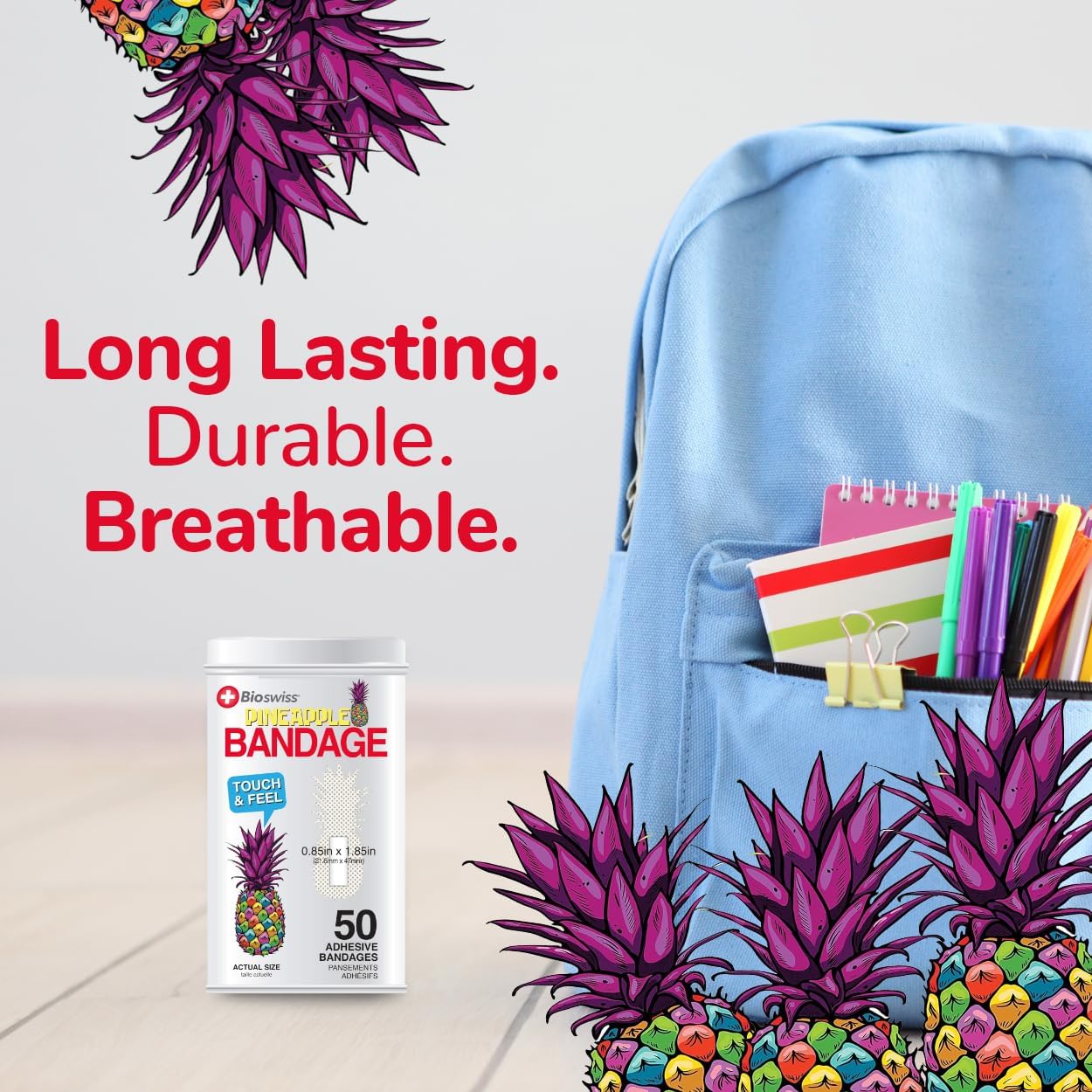 BioSwiss Bandages, Pineapple Shaped Self Adhesive Bandage, Latex Free Sterile Wound Care, Fun First Aid Kit Supplies for Kids, 50 Count