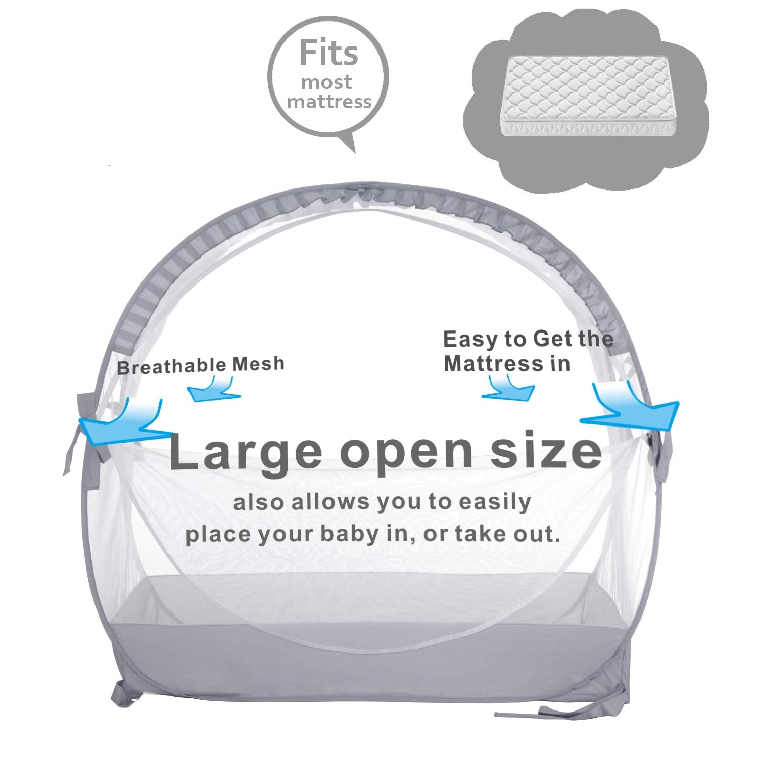 - NO MOSQUITOES AND BREATHABLE: This crib pop up tent is made from highest quality, with 1200 holes / inch small enough to keep even small bugs or insect out, can also be used to prevent cats / pets from entering the crib. It has a strong, breathable mesh that keeps creepy crawlies out without affecting air circulation.