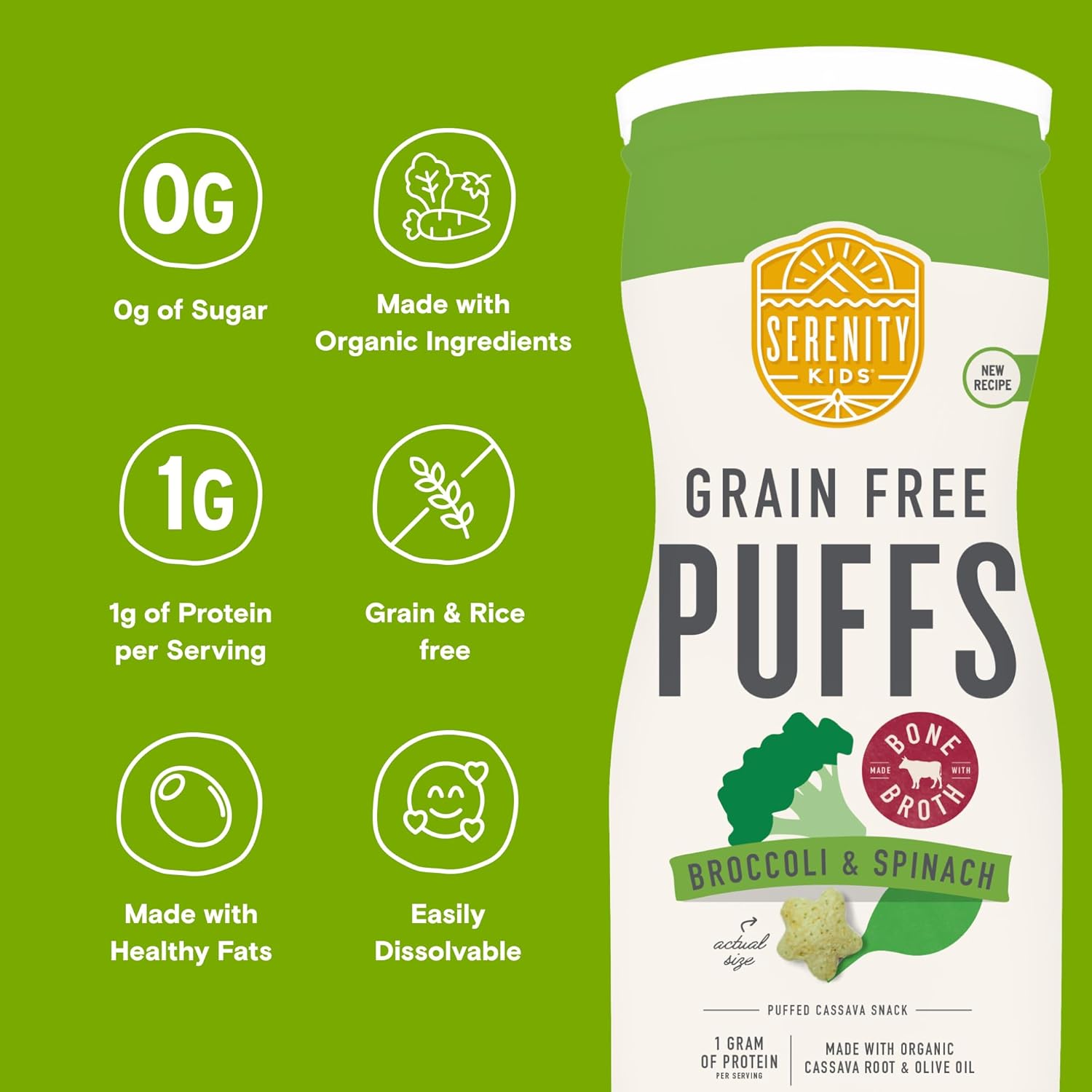Serenity Kids 6+ Months Baby Veggie Puffs Toddler Snacks - Grain & Gluten-Free No Added Sugar - Organic Cassava Broccoli & Spinach - 1.5 Oz, 6 Pack
