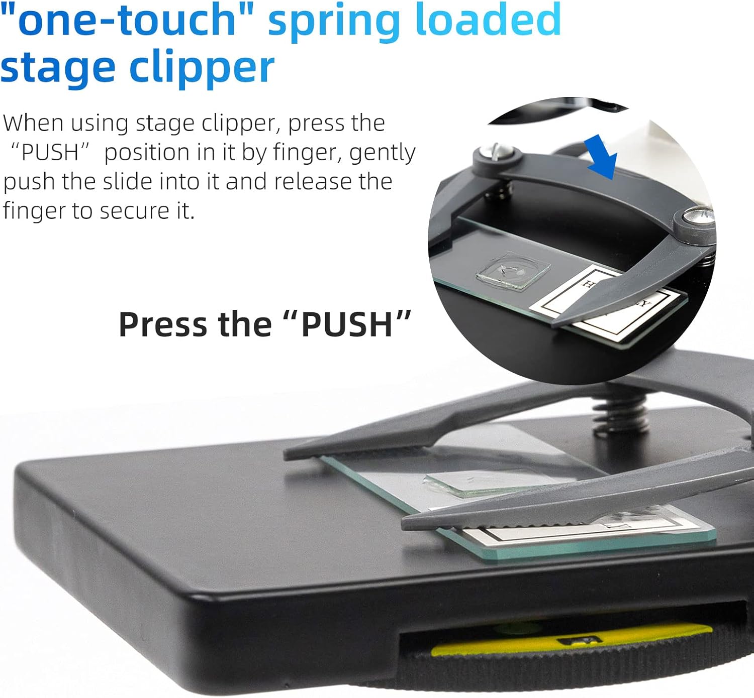 - [Multiple Humanization Designs] 45°inclined ocular tube with 360° rotatable head lets you observe comfortably and share view with friends. Coaxial coarse & fine focusing knobs. Equipped with "one-touch" spring-loaded stage clips, which is easy to place a slide. Spare bulb is included for replacement