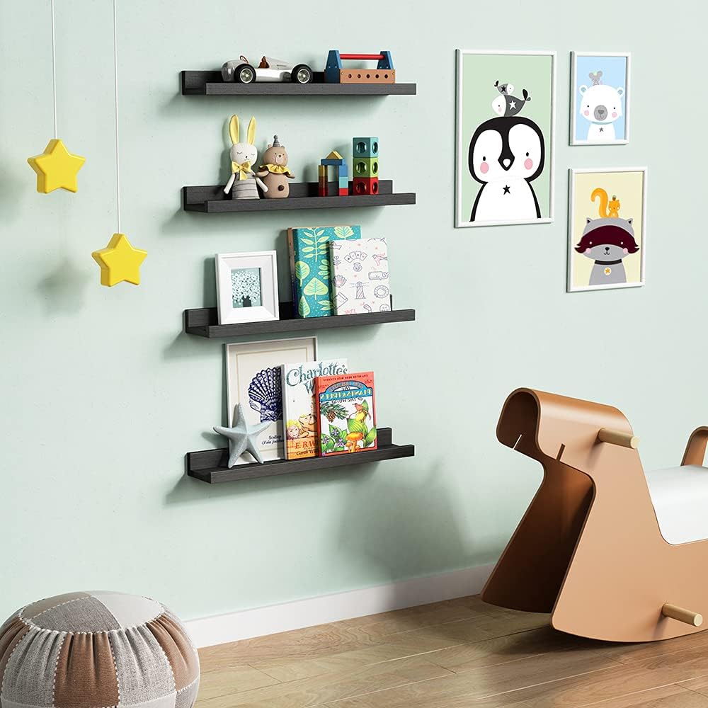 Forbena 24 Inch Long Picture Ledge Shelf Set of 4, Black Wood Floating Shelves for Wall with Lip, Rustic Display Shelves for Living Room Hallway Bedroom Office Photo Frames Bathroom Nail Polish