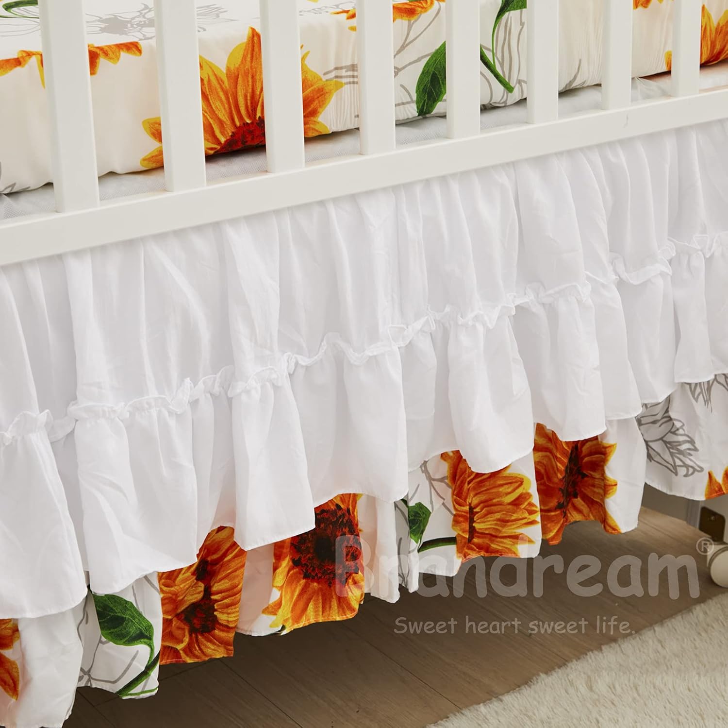 - Girls farmhouse nursery bedding 6 piece includes: Ruffle sunflower blanket (28"x40"), yellow white fitted crib sheet have a 10"drop, sweet ruffle skirt has a 16" drop on all four sides, diaper stacker, heart pillow, american country valance. All fits standard crib bed.
