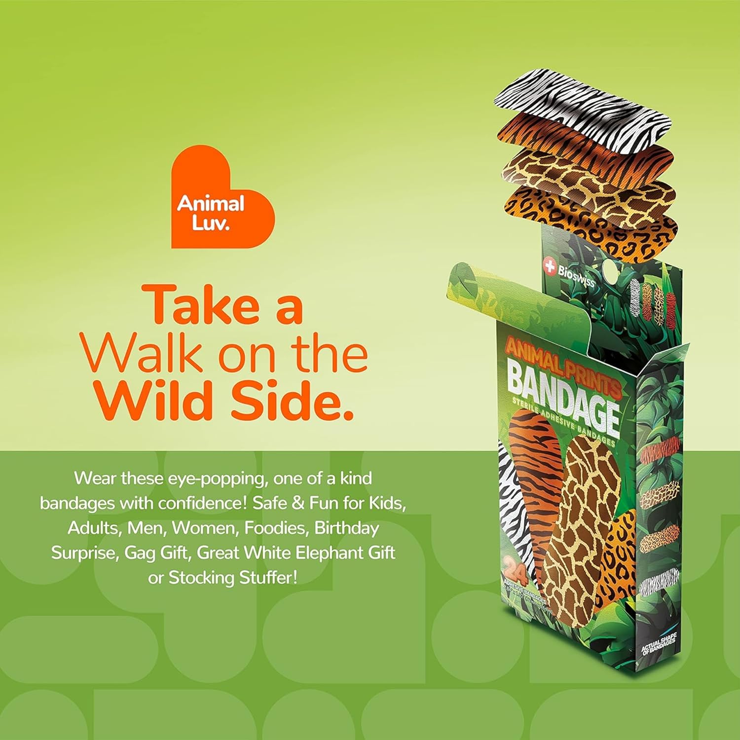 BioSwiss Bandages, Animal Prints Self Adhesive Bandage, Leopard, Zebra, Giraffe, and Tiger Print Designs, Latex Free Sterile Wound Care, Standard Shape for Kids and Adults, 24 Count