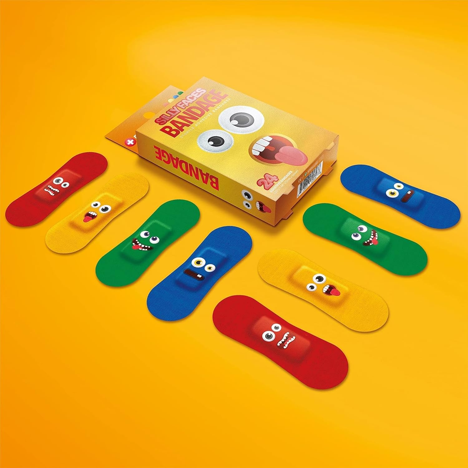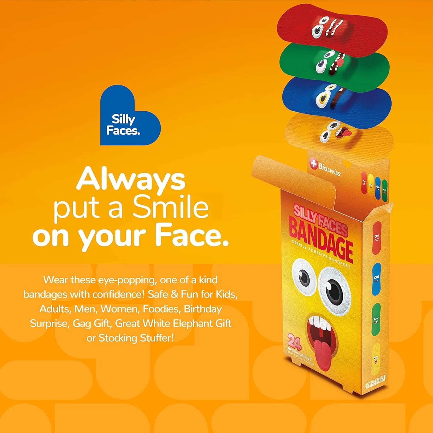 - SILLY FACES BANDAGES: This 24 piece pack of cute and hilarious looking silly face bandages is great for putting a smile on kids' faces while protecting wounds such as cuts, scrapes, and burns, and come in 4 assorted styles; sticky bandages are perfect for kids and adults alike, and also for school nurses and pediatric doctors