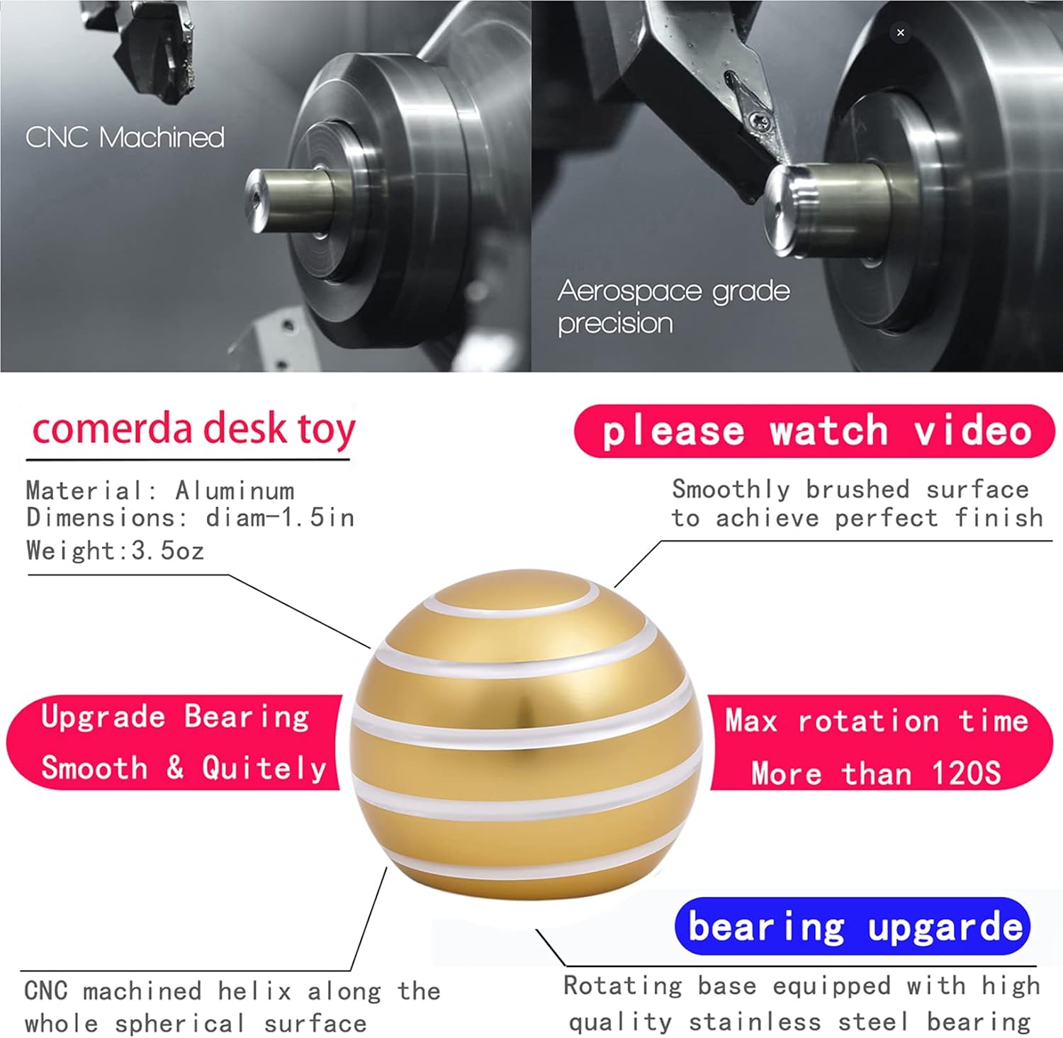 • 1.5in & 3.5oz. Precision CNC manufactured metal desk toy with threaded grooves on the surface.