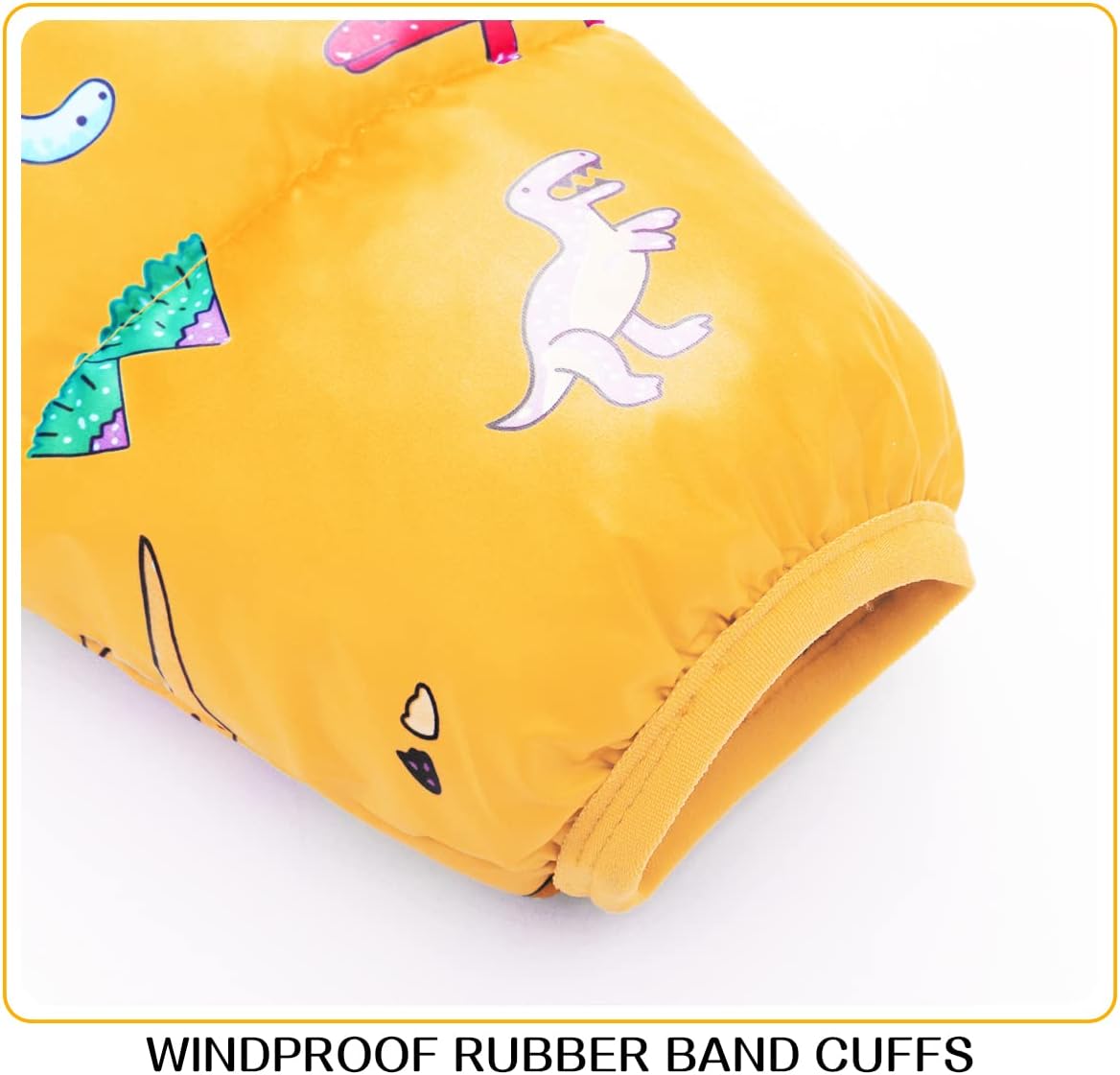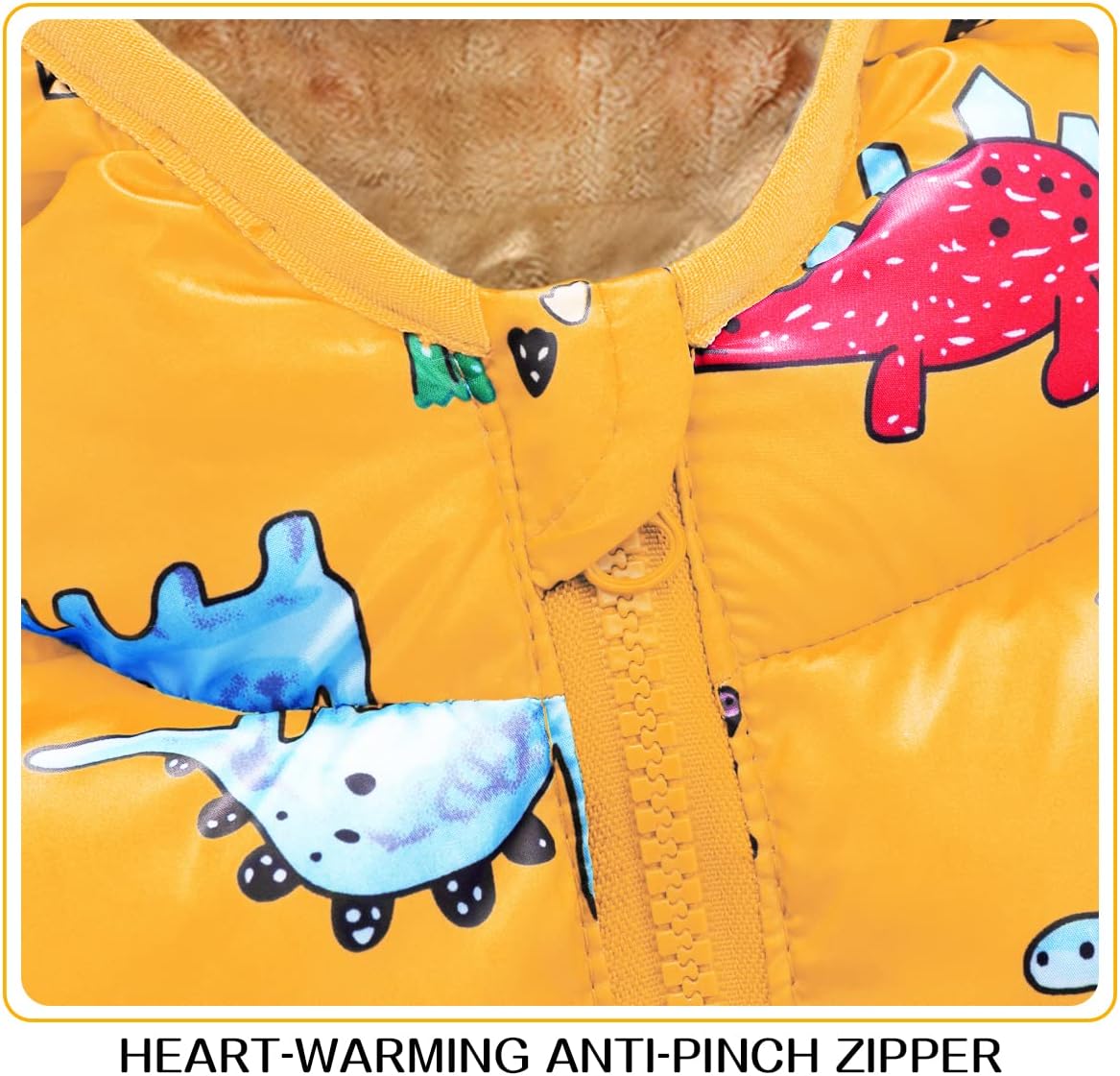 - 【Design】: The winter coat is Designed with cute cartoon dinosaurs and space prints, and is available in three colors of blue, yellow and gray. The winter clothes has a certain windproof and coldproof effect, toddler winter coat is filled with polyester fiber, which makes the clothes very light, inner layer of the clothes is cotton fluff, double-layer Design keeps the baby warm and comfortable.