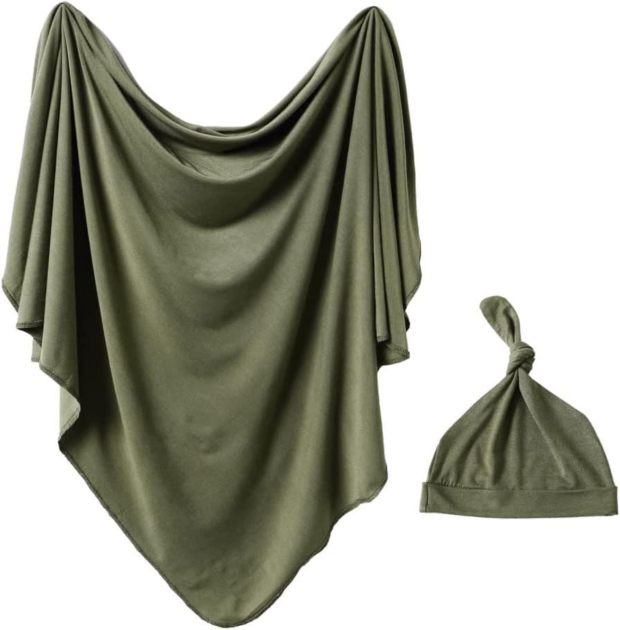 iEvolve Cotton Knitted Baby Swaddle Blanket with Hat Headband Set Newborn Swaddle Wrap Receiving Blankets for Baby Girl Boy 45" x 45"(OliverGreen)