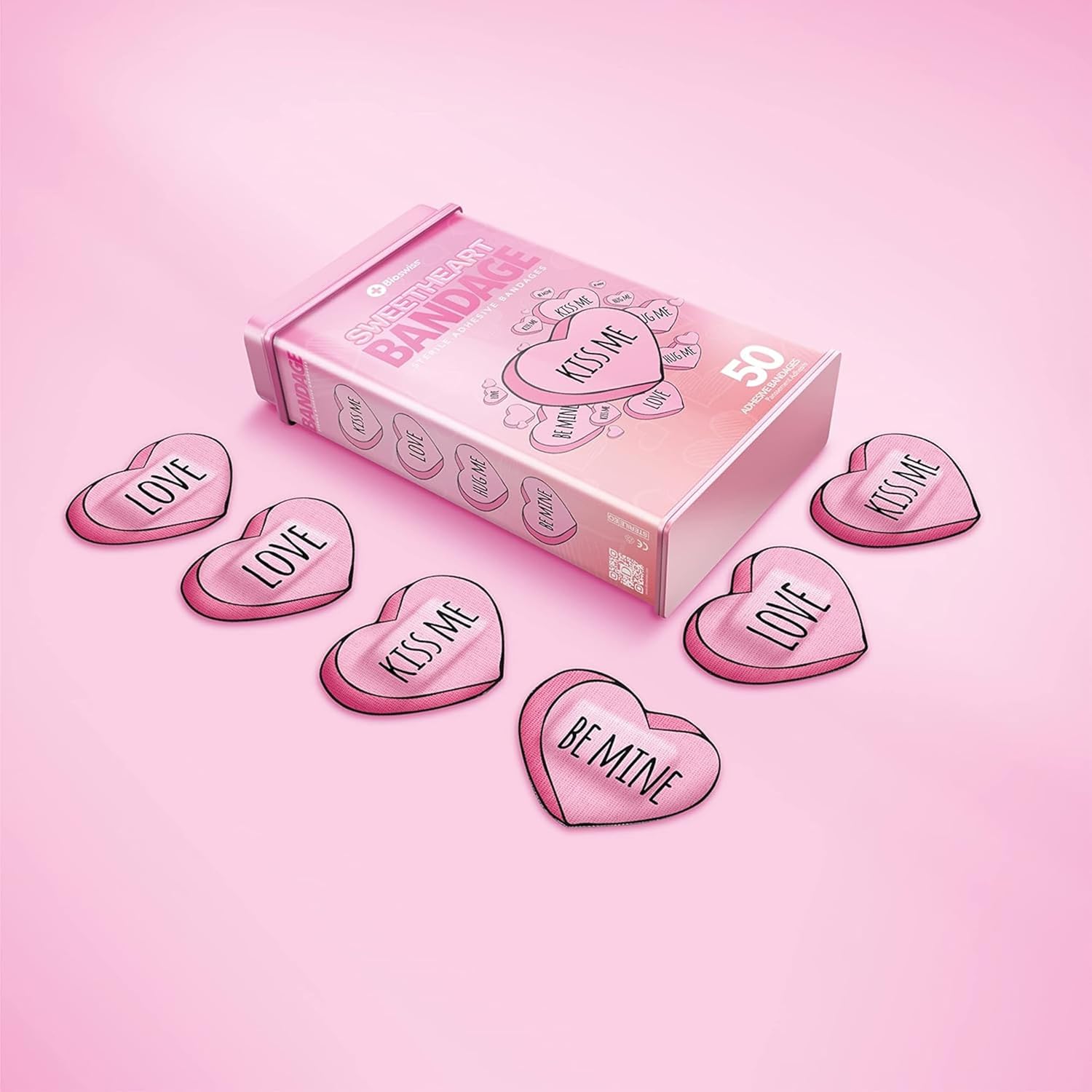 - VALENTINE HEART BANDAGES: This 24 piece pack of funny Valentine heart "Kiss Me" bandages is great for putting a smile on kids' faces while protecting wounds such as cuts, scrapes, and burns, and come in 4 assorted styles; sticky bandages are perfect for kids and adults alike, and also for school nurses and pediatric doctors