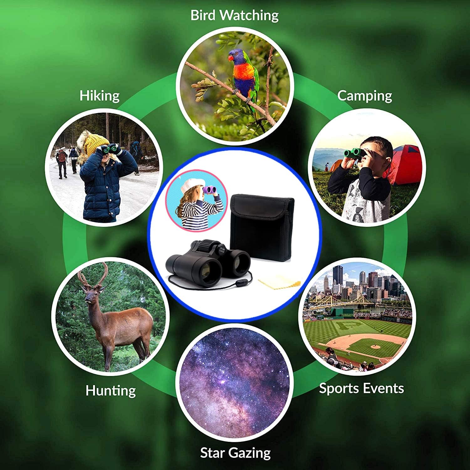 - Best Gift for Kids : Designed for kids binoculars,soft-rubber eyepiece protect the eys, so kids won't hurt their eyes.The compact kids binoculars can be folded to match eye to eye Distance Of Child.Great for bird watching, learning, hunting, theater, boat rides, hiking, traveling, and enjoying the wilderness! Explore the world with your kids!Perfect For The Children's Toy Or Educational Gifts