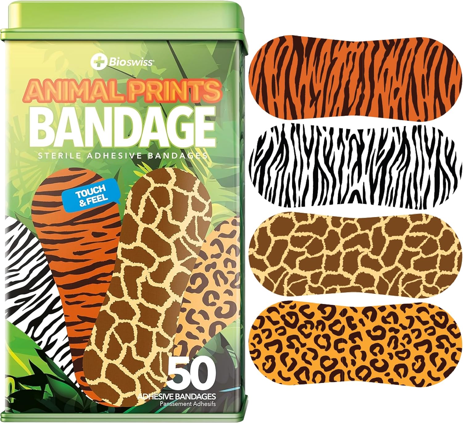 BioSwiss Bandages, Animal Print Shaped Self Adhesive Bandage, Latex Free Sterile Wound Care, 50 Count