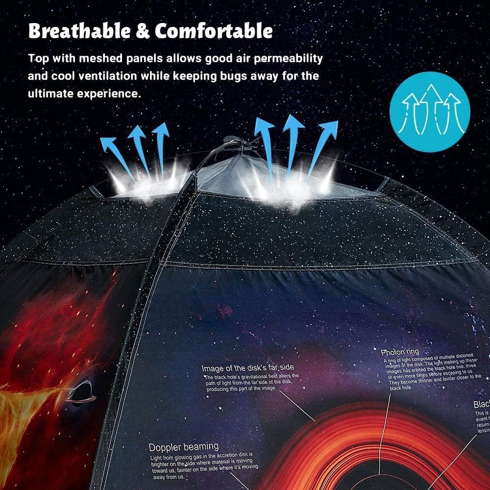 - 🌠【ATTRACTIVE and UNIQUE】:This kid’s play tent delightfully designed with adorable glowing stars with a black hole explained design that will catch your kids’ attention. The pop-up tent for kids will ignite fun, creativity and imagination play, space exploration while stimulating physical play.