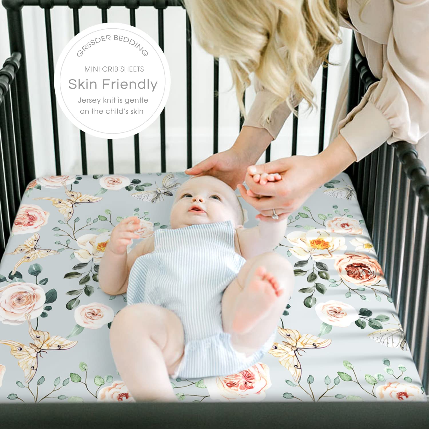 - Ultra Soft & 4-way Stretch: Made of extra soft stretchy jersey knit fabric. GRSSDER mini crib sheets offer a breathable, sweat-absorbent tee shirt like feel for exceptional comfort, providing your little ones a safe and to stay in place throughout the day.