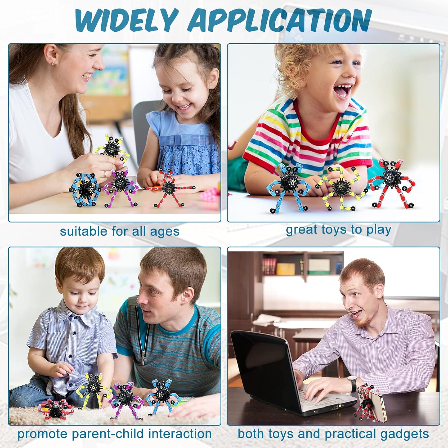 - Stress Relief and Pressure Release: you can rotate the transformable fingertip spinners at random, use your finger to control how fast they rotate; And feature deformable chains, you can twist them to any shape you want and like without thinking, during these process, you can give your brain a break from the stress and pressure of work or school in daily life
