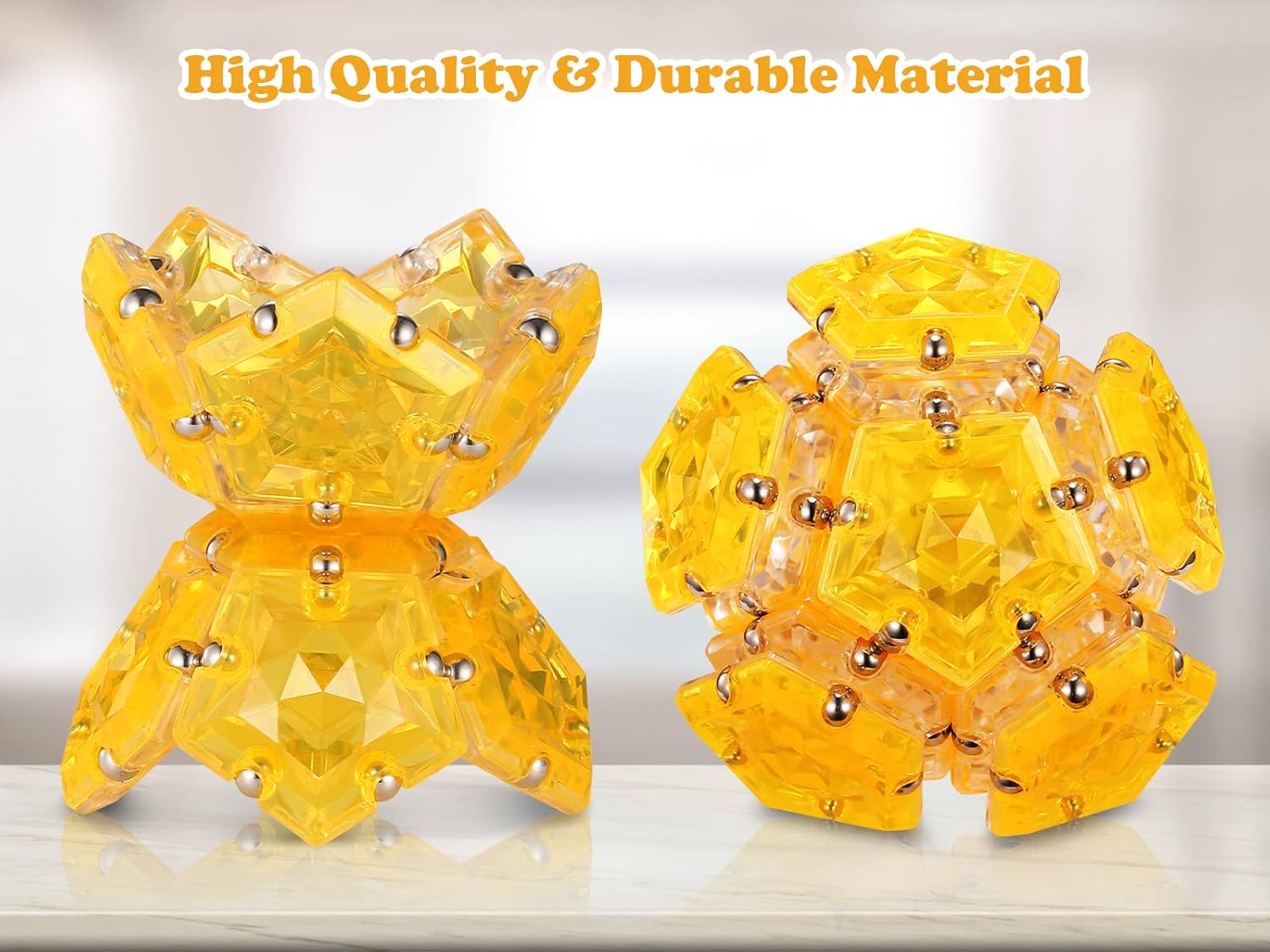 - [Excellent Quality, Unique Design]: Nothing compares to the quality & unique design of this magnetic balls, each panel has a stunning crystal and smooth surface of high quality, durable. Made with 60 high strength neodymium magnets, magically self-aligning to over 100 shapes and formations.