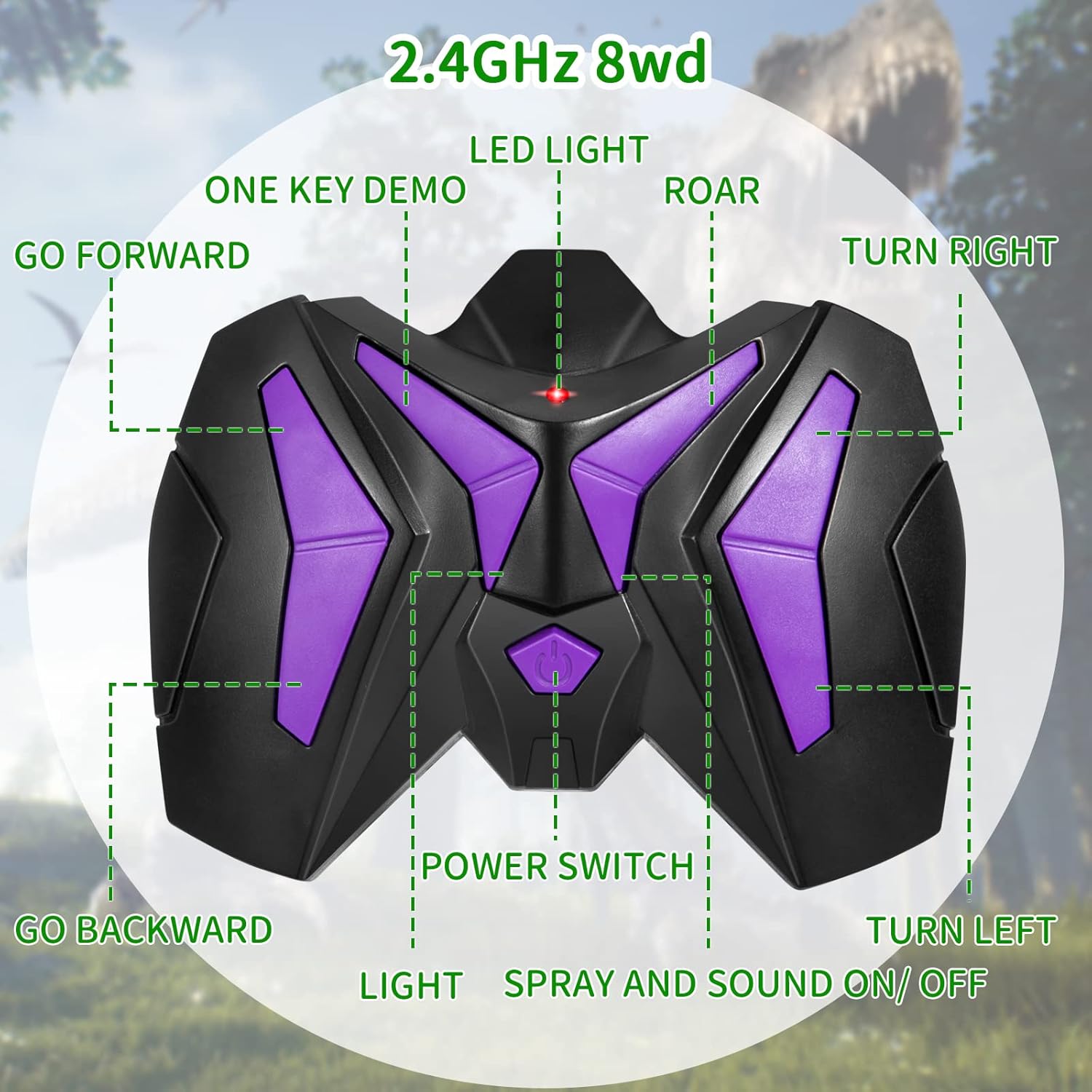 - Multifunctional Dinosaur: Figures with water mist spray(under red light which looks like fire breathing) and dinosaur roars. Separate button controls forward and backward, turn right and left, “One key demo” allows it to perform specific actions which looks like it was dancing.