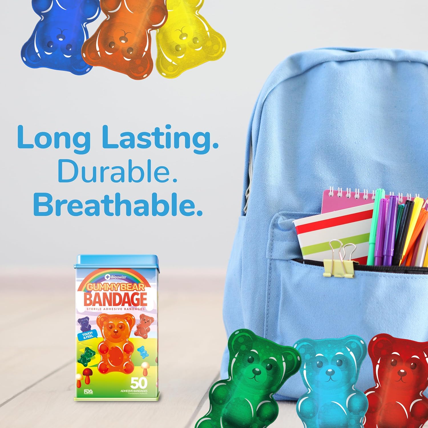 - GUMMY BEAR BANDAGES: This 50 piece tin of adorable and delicious looking gummy bears bandages is great for putting a smile on kids' faces while protecting wounds such as cuts, scrapes, and burns, and come in 6 assorted styles; sticky bandages are perfect for kids and adults alike, and also for school nurses and pediatric doctors