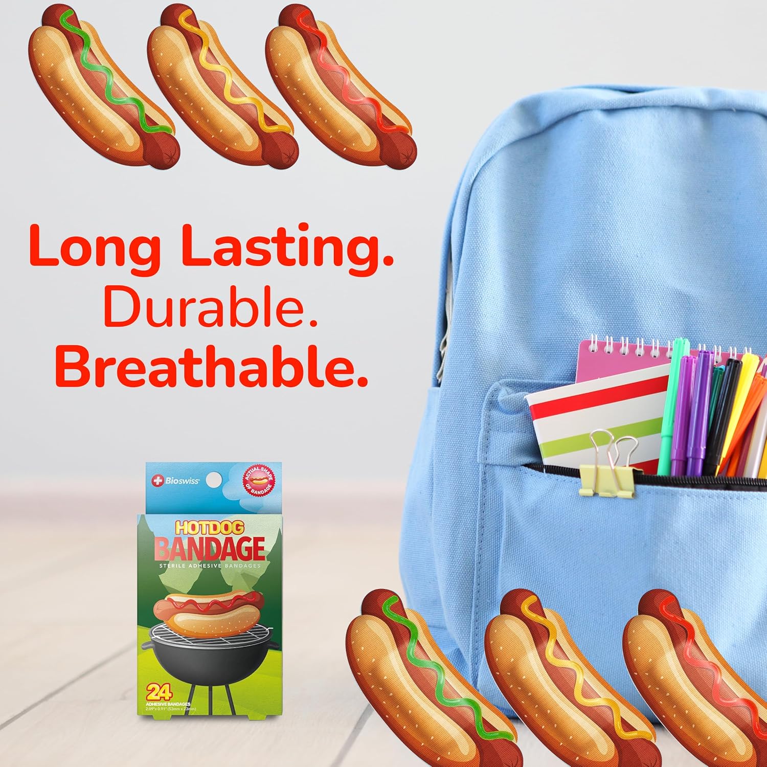- HOT DOG BANDAGES: This 24 piece pack of adorable and delicious looking hot dog bandages is great for putting a smile on kids' faces while protecting wounds such as cuts, scrapes, and burns, and come in 4 assorted styles; sticky bandages are perfect for kids and adults alike, and also for school nurses and pediatric doctors