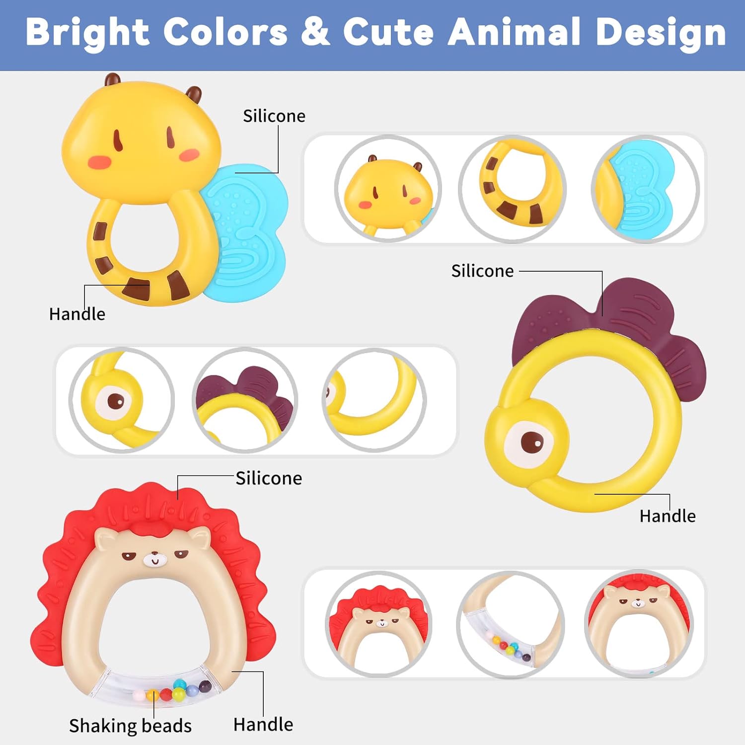 - Early Development Infant Toys: Open the door to a new world for your baby! Babies will love touching, spinning, shaking, and chewing these rattle toys. Most baby toys make fun sounds when the babies shake the toys, numerous sounds will attract your little one's attention and promote auditory development. Designed with bright colors and unique animal shapes, promoting the child's visual development.