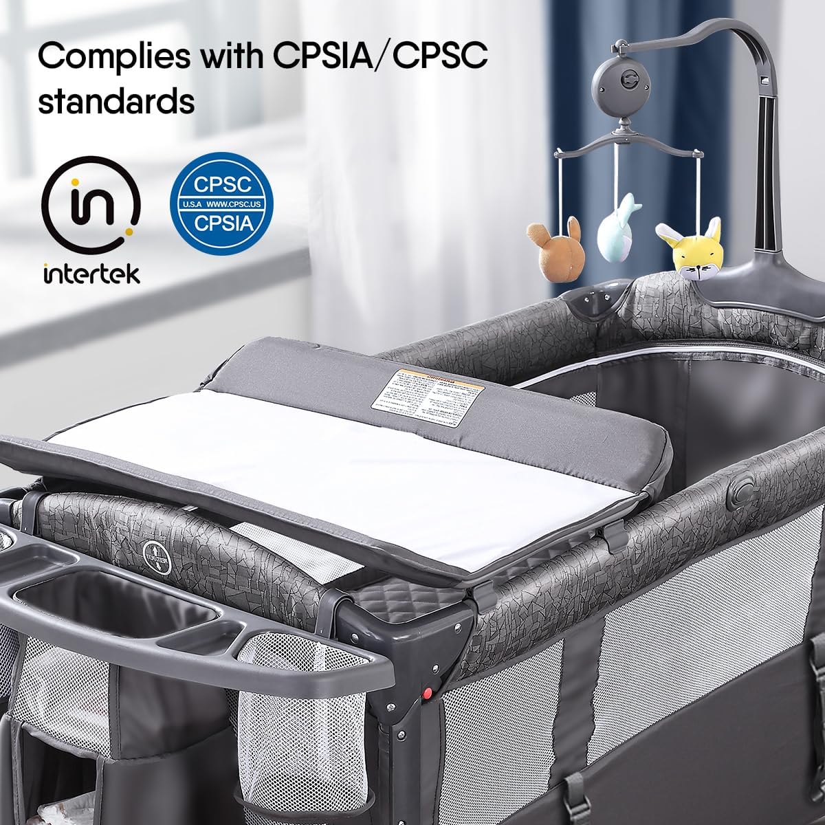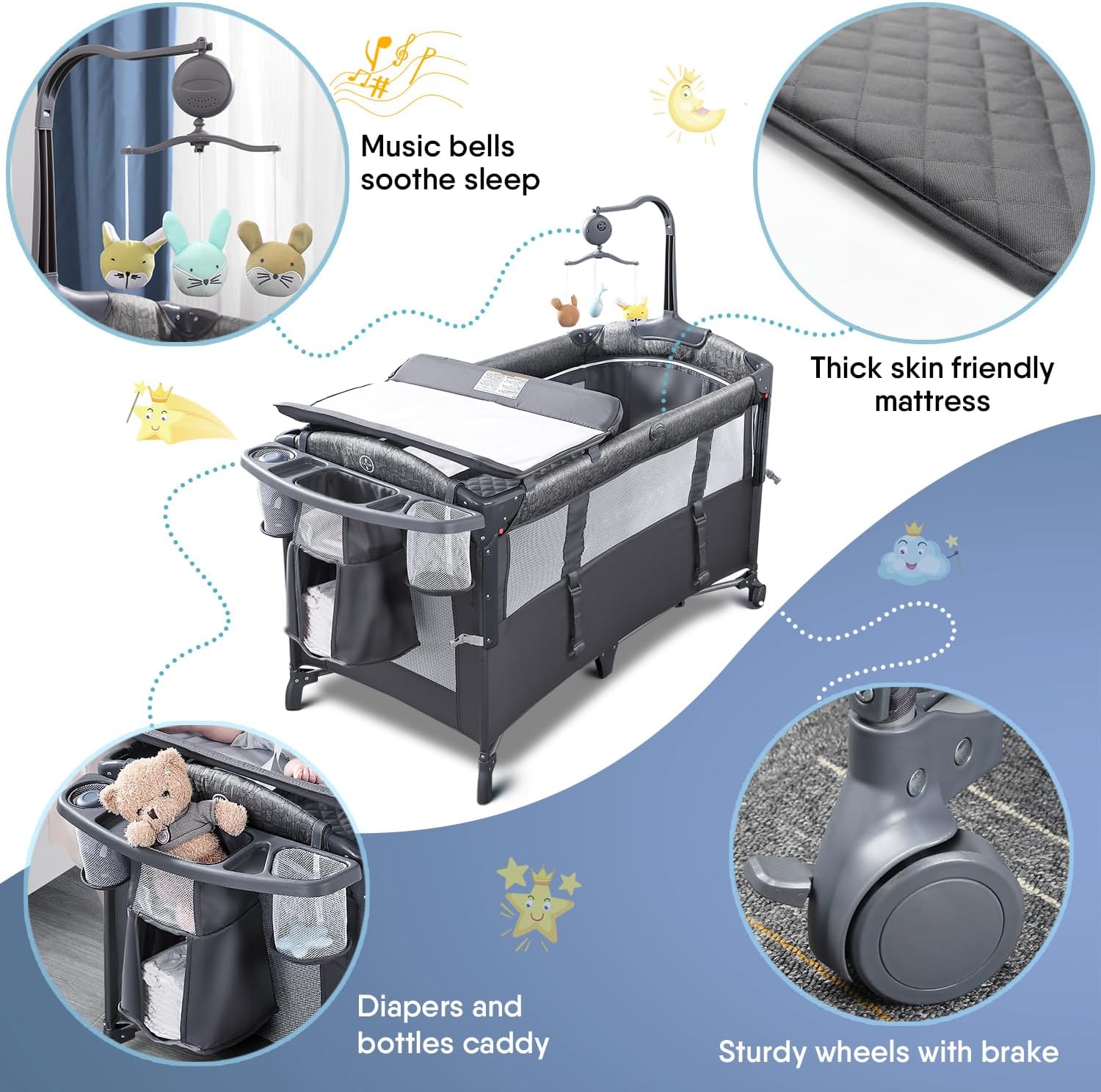 - Spacious and Fun Entertainment Space: The bottom floor can be used as a playpen for babies to toddlers (0-3 years old), providing creative space for your baby and enhancing interaction between mother and child. Music box with 3 plush toys, when your baby cries, you can easily rotate the music box to make her happy, cheerful music can attract the baby's attention, hanging toys can also promote the baby's visual development