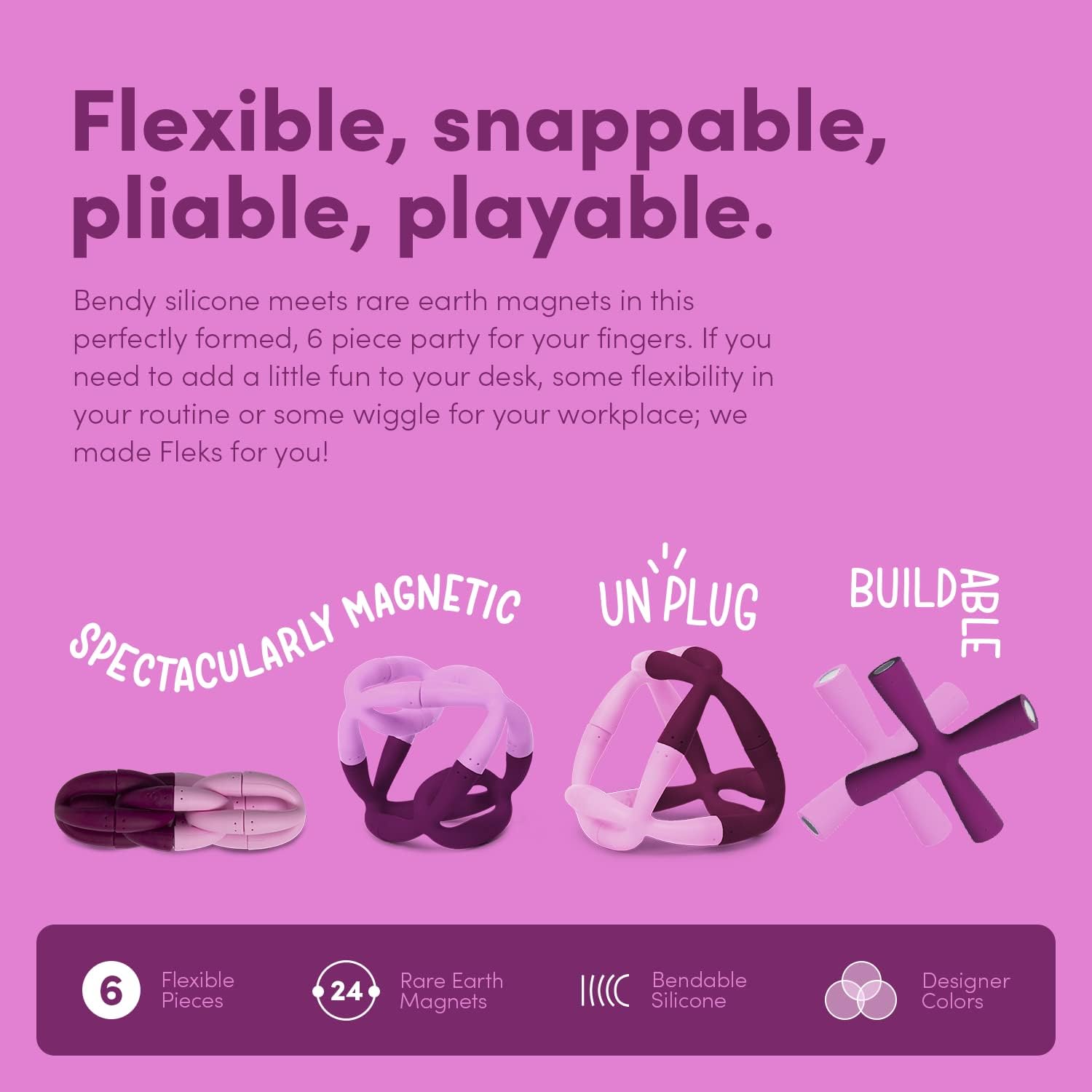 - THE ORIGINAL SILICONE DESK TOY: 6 piece party for your fingers. If you need to add a little fun to your desk, some flexibility in your routine or some wiggle for your workplace; we made Fleks for you!