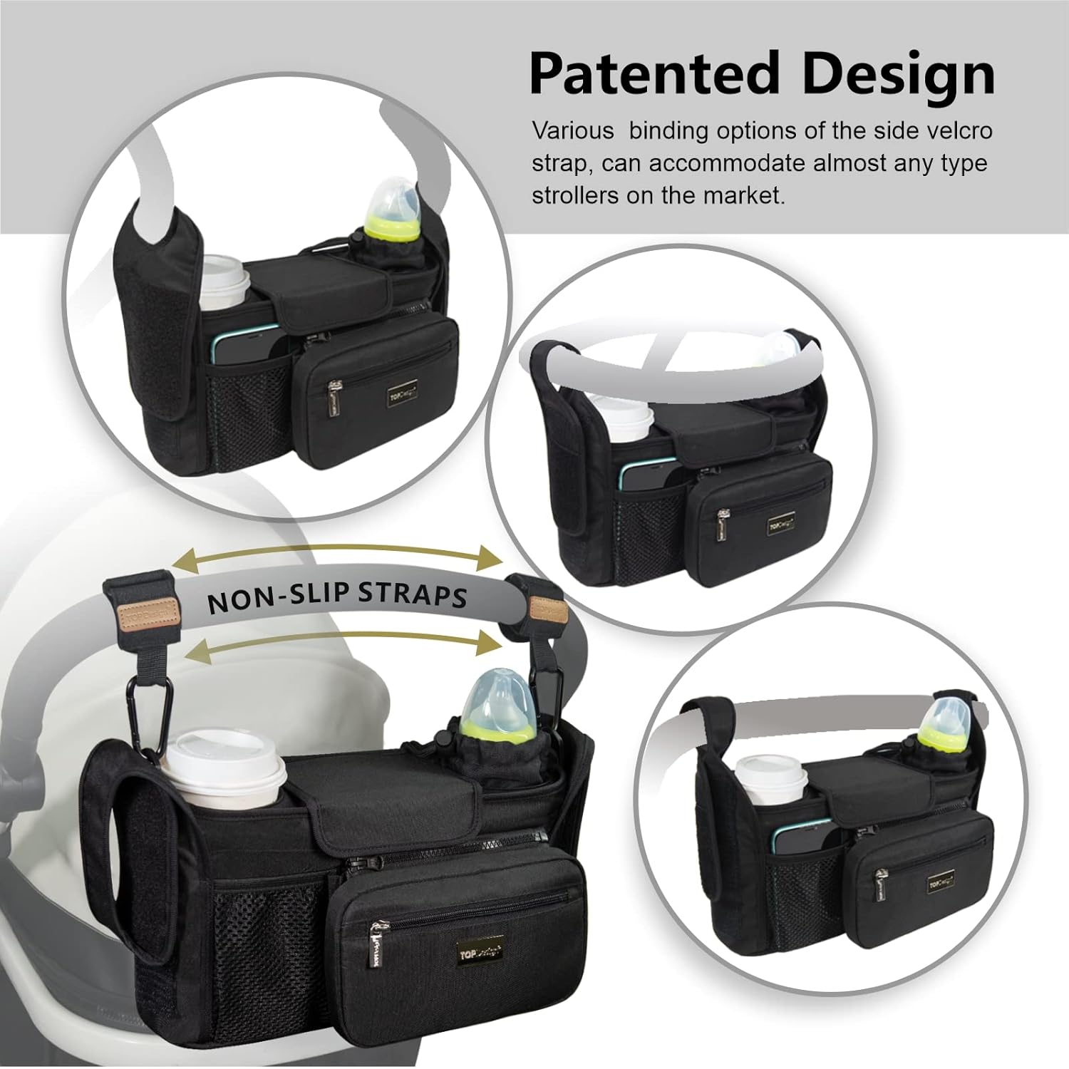 TOPDesign Universal Baby Stroller Organizer, Stroller Caddy with Heightened Insulated Cup Holders & Non-Slip Secure Hooks Accessories, Fits Most Strollers, Machine Washable (Black)