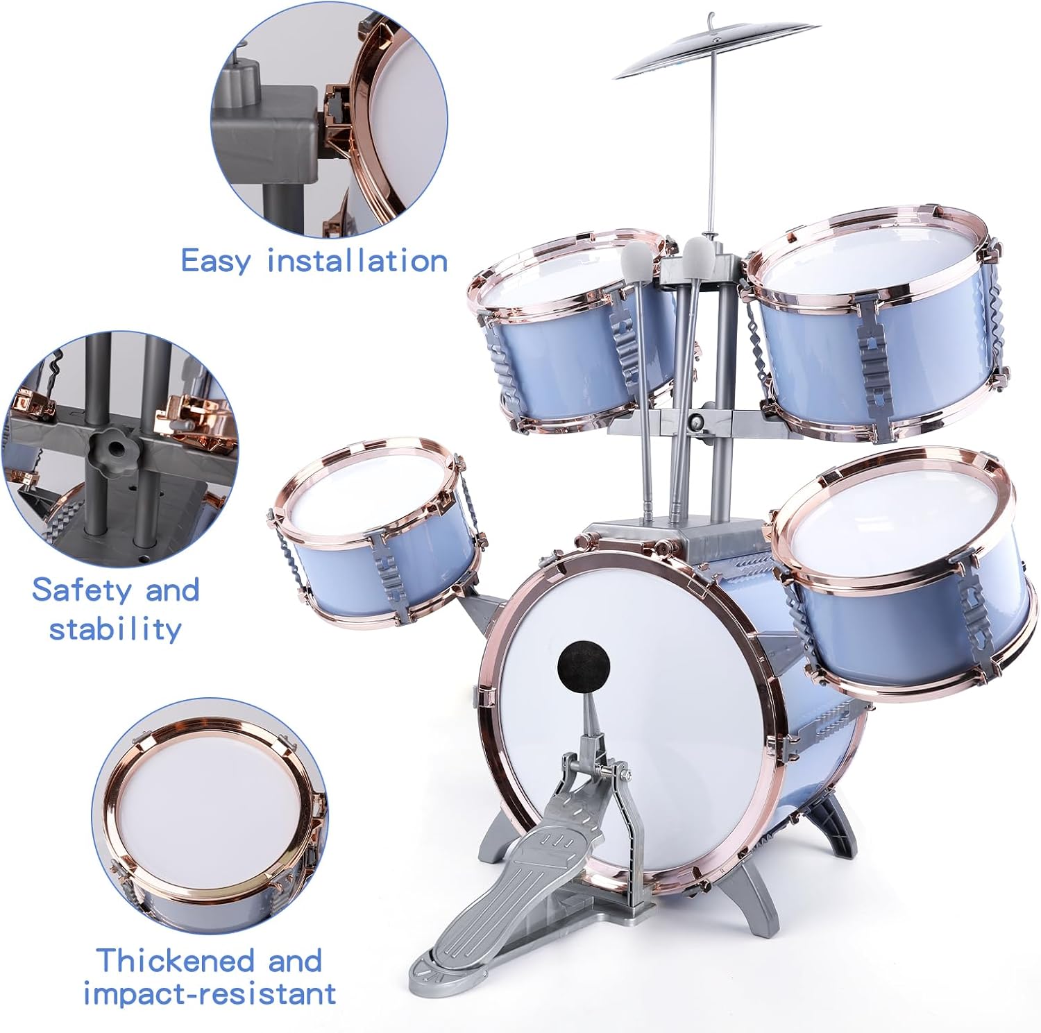 - STABLE STRUCTURE & HIGH QUALITY: The sturdy construction of the stool and drum set allows children to sit safely and play the drums happily. The jazz drum kit is made of environmentally friendly plastic material with fine details, light weight but sturdy and reliable. The high-quality design of this beginner drum set produces a clean and loud sound that allows children to play beautiful music, suitable for developing their musical abilities.