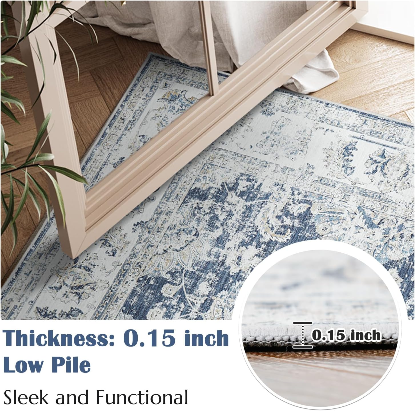 jinchan 6x9 Area Rug for Living Room Machine Washable Vintage Floral Distressed Design Stain Resistant Boho Carpet Ultra-Thin Low Pile Non-Slip Rug for Bedroom Dining Room Home Office(6‘x9',Dark Blue)