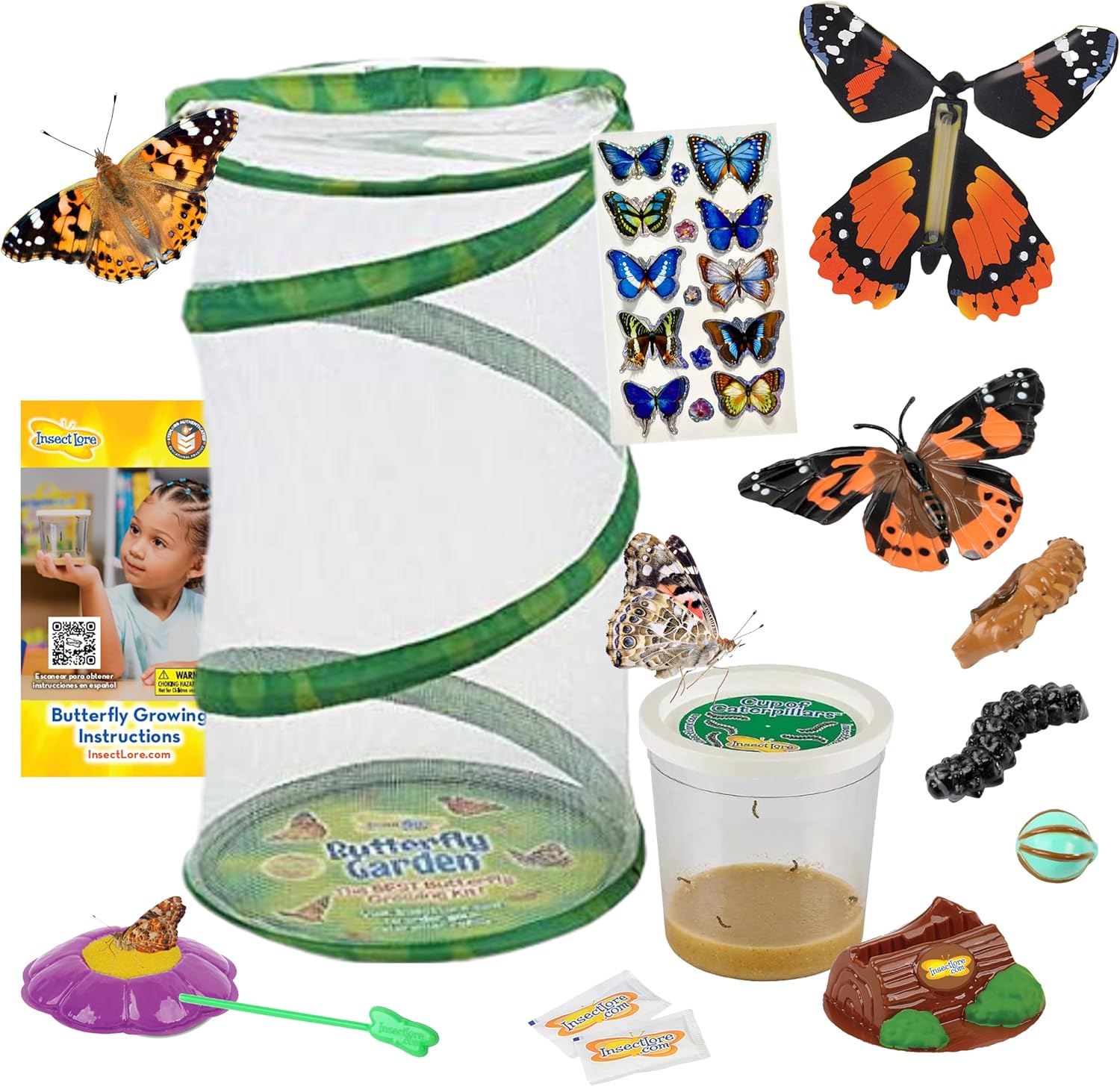 - Includes 1 Cup of Caterpillars containing 5 live baby Painted Lady caterpillars along with their food, a reusable/washable mini habitat, Chrysalis Holding Log, Flower-shaped Butterfly Feeder, sugar packets for butterfly nectar, feeding dropper, Life Cycle Figurines, 3D Butterfly Stickers, Butterfly Wind-Up, and instructions.