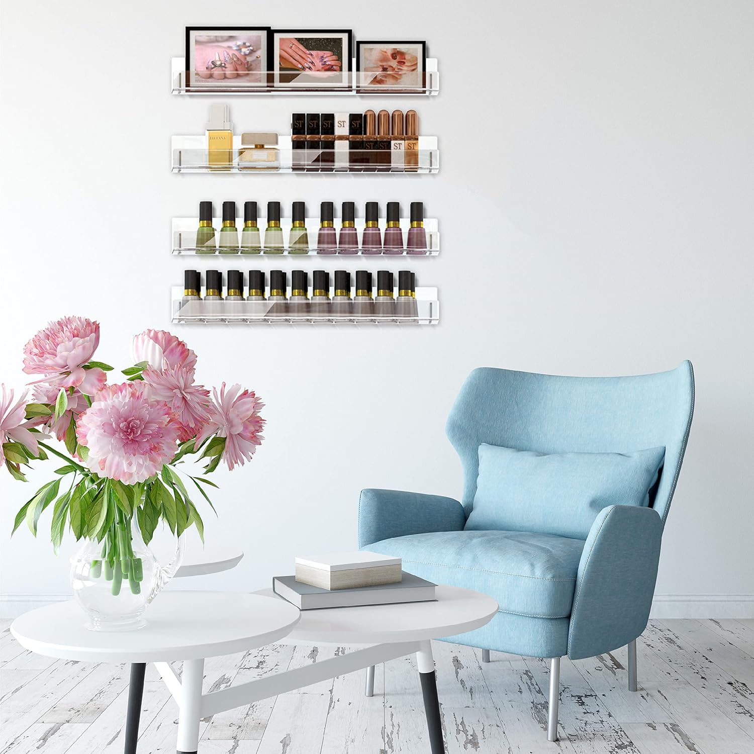 4 Pack 15 Inch Clear Acrylic Shelves, Clear Kids Floating Bookshelf for Kids Room, Modern Nail Polish Rack Sunglasses Essential Oil Picture Ledge Display Toy Storage Wall Shelf