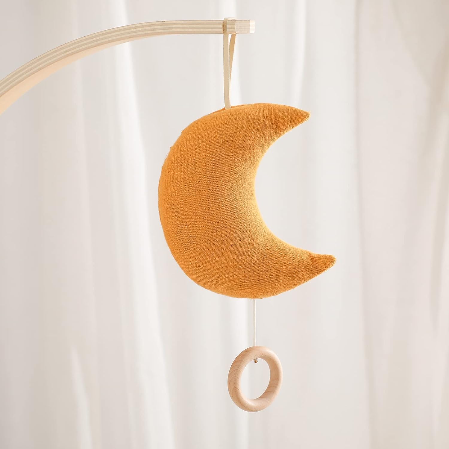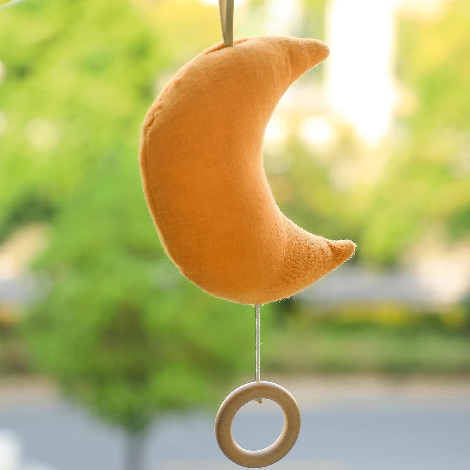 - ๐ BABY TACTILE TOY QUALITIES - This moon-themed travel toy features an adorable shape, playful chime and soft fabric texture. Fabric loop allows for attachment to most carriers, strollers, play gyms, cribs and more. Size - L*W*H: 15cm*13cm*5cm (5.9"*5.1"*1.9"); Length of the hanging loop: 8.5 cm(3.3''); Length of the cord: 5cm-25cm (1.9''-9.8'')(contract and extend).