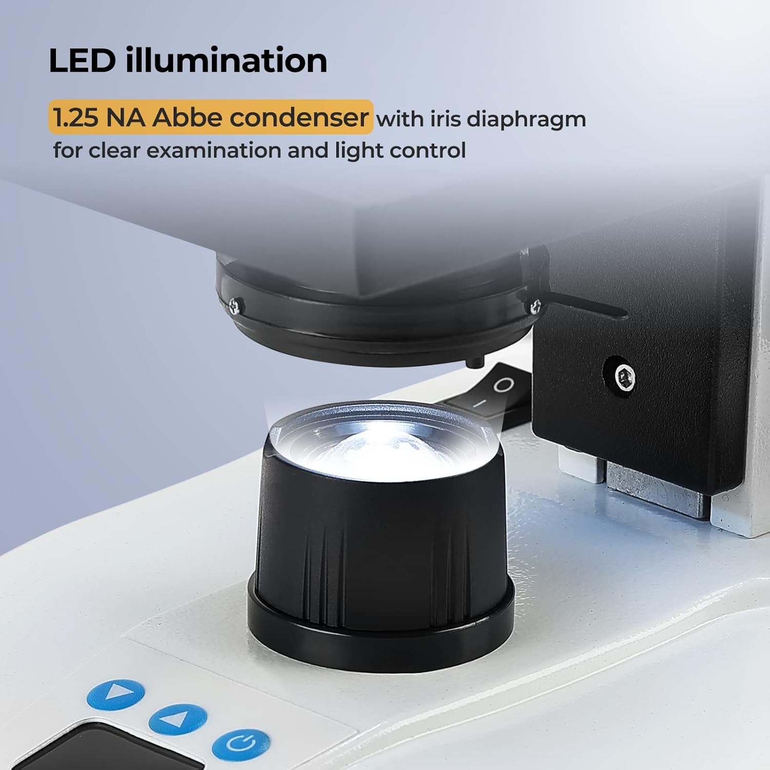- [Eyepieces & LCD Screen]: Equipped with WF10X/25X/H16X glass eyepieces fixed at an ergonomic 30 degree tilt to reduce neck strain, easily adjustable for different interpupillary distances without losing focus, 5MP E-eyepiece and 360 degree 7" LCD display allows you to get a larger field of view directly from the screen without an external large screen display, provide a more comprehensive view and enable sharing. 4 Achromatic objectives offer 4x 10x 40x(s) 100x(Spring Oil).