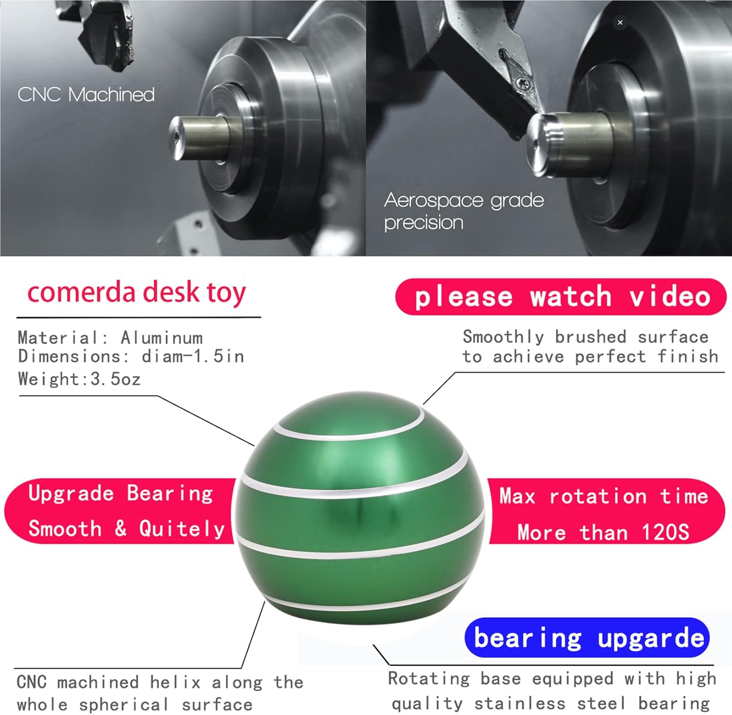 - 1.5in & 3.5oz. Precision CNC manufactured metal desk toy with threaded grooves on the surface.
