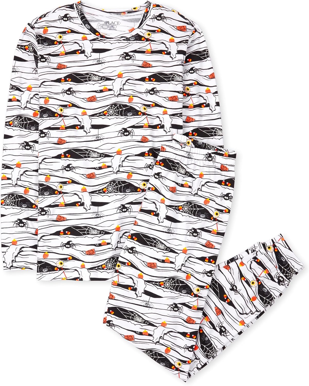 • PAJAMA TOP — Features long sleeves, rib-knit crew neck, banded sleeve cuffs and allover glow-in-the-dark mummy and candy print. For best glow effect, expose to light before wearing.