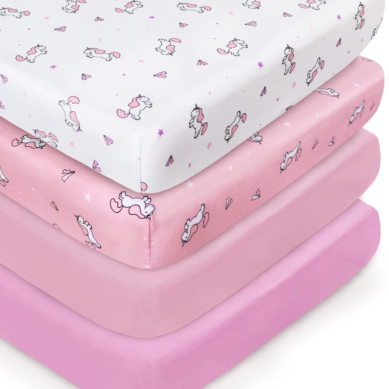 Girl Crib Sheets 4-Pack, Fitted Sheets 52'' x 28'' for Standard & Toddler Mattress, Soft Breathable Material, Neutral & Pink