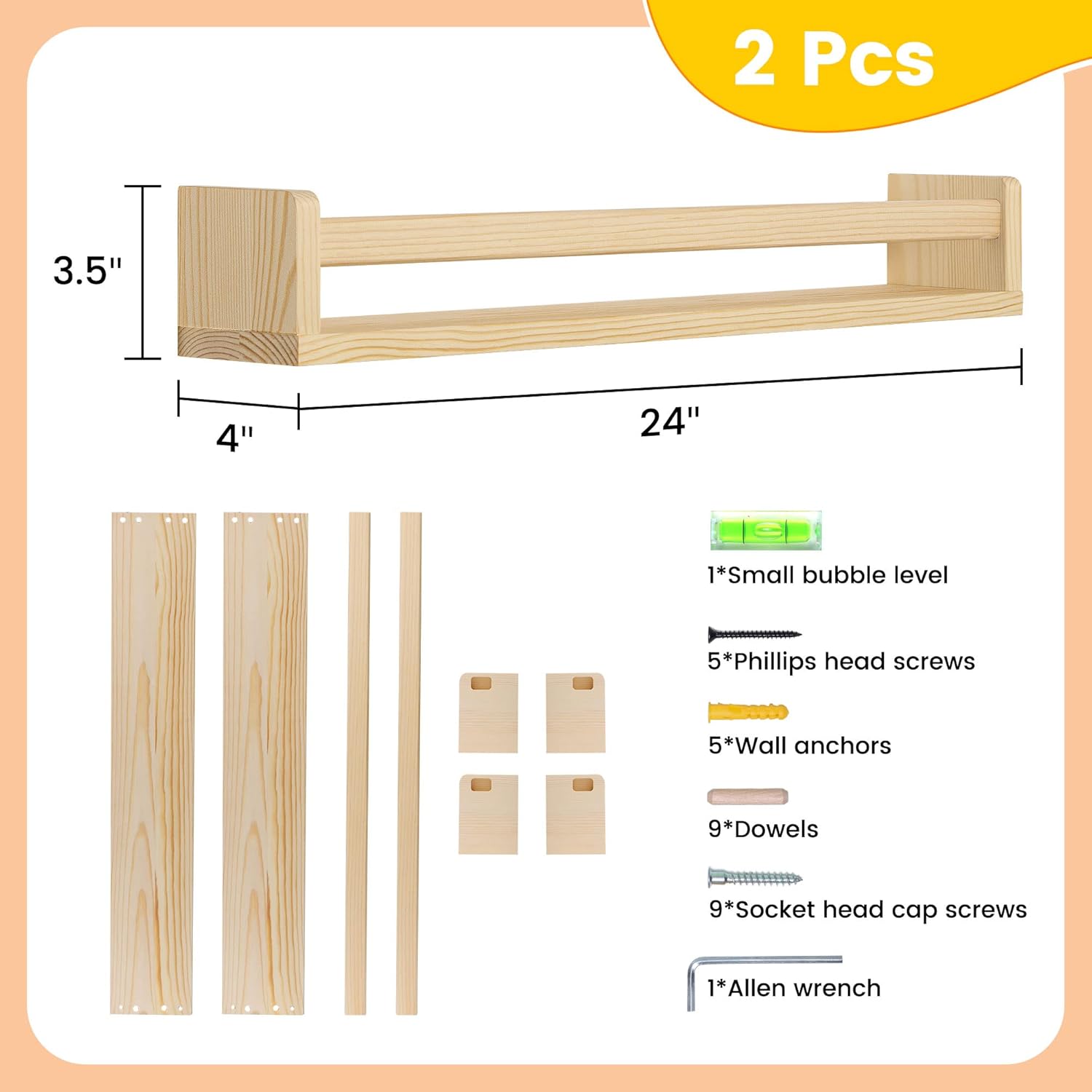 Fun Memories Nursery Book Shelves, 24Inch Floating Shelf for Wall, Wall Bookshelf for Kids Solid Wood Wall Mounted Shelves for Books,Toys and Decor Storage, Set of 2