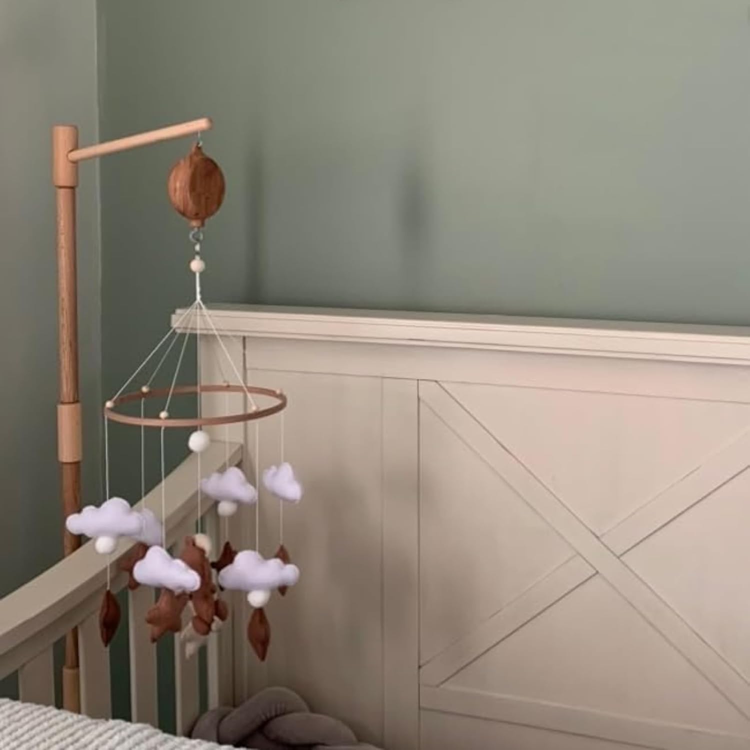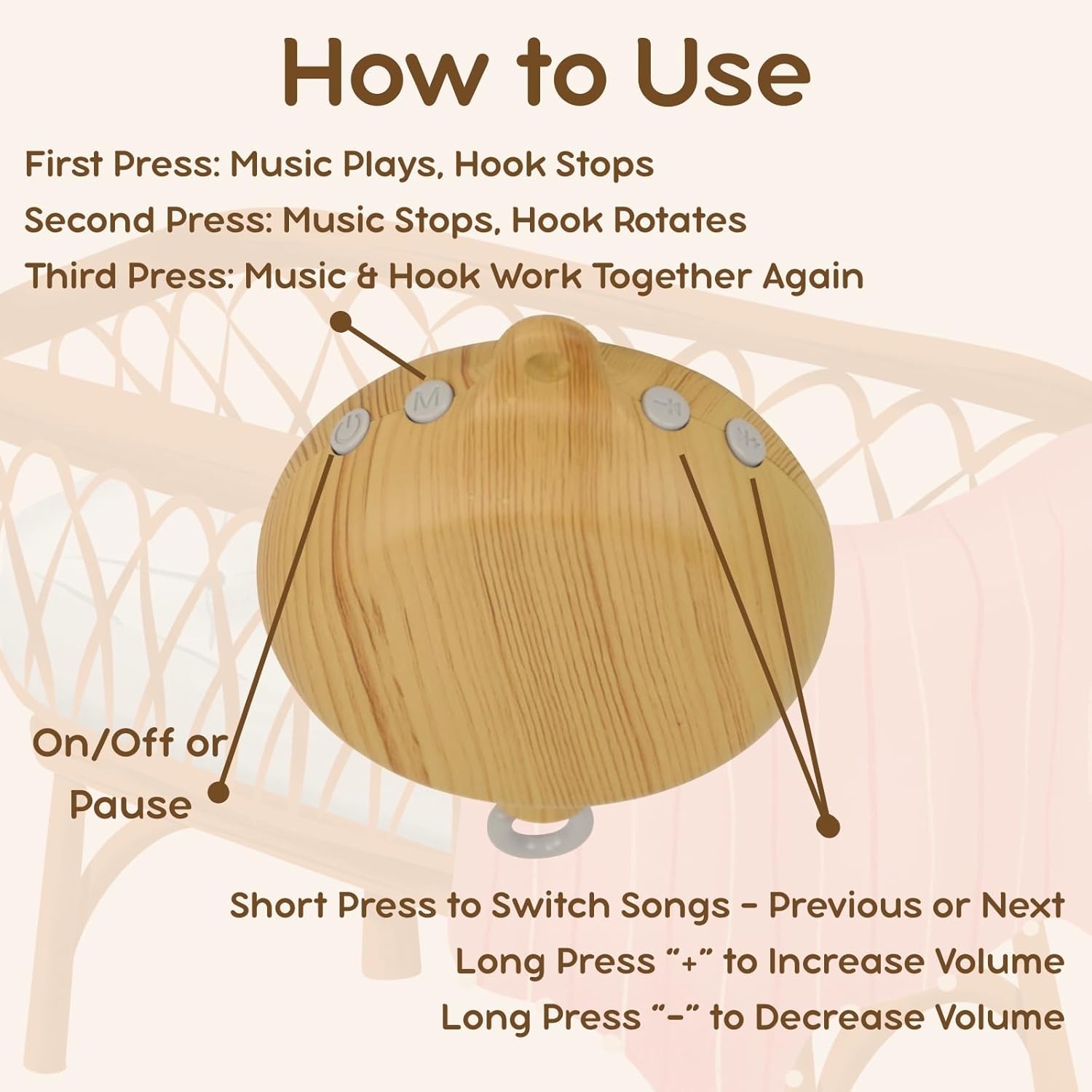 - 【REALISTIC WOOD TEXTURE】 – Designed with an imitation wood finish, this crib mobile music box blends perfectly with wooden crib arms, adding a warm and natural touch to your nursery décor. Crafted from non-toxic, durable ABS, safe even if your baby chews on it. (Requires 2 AA batteries, not included.)